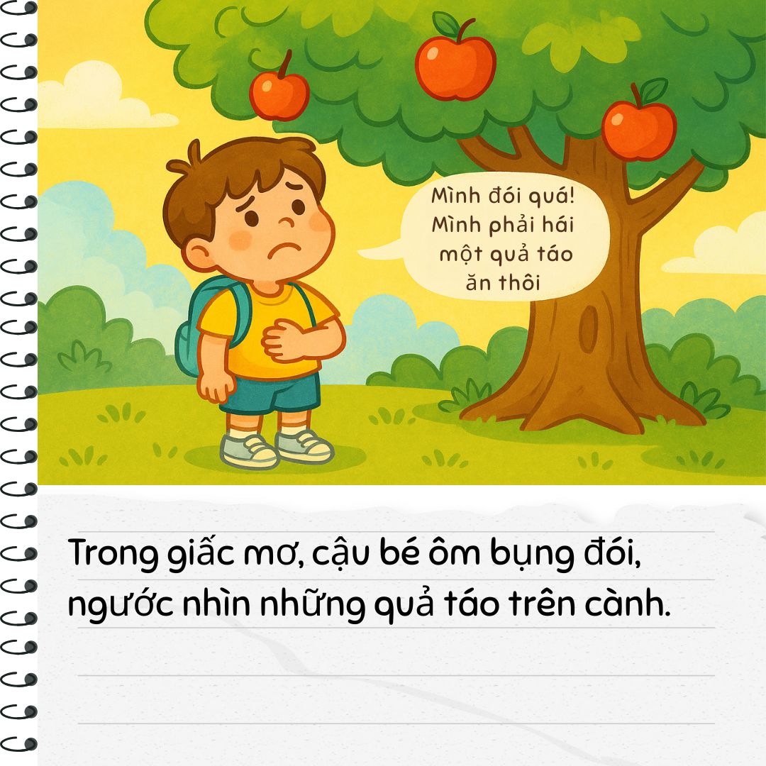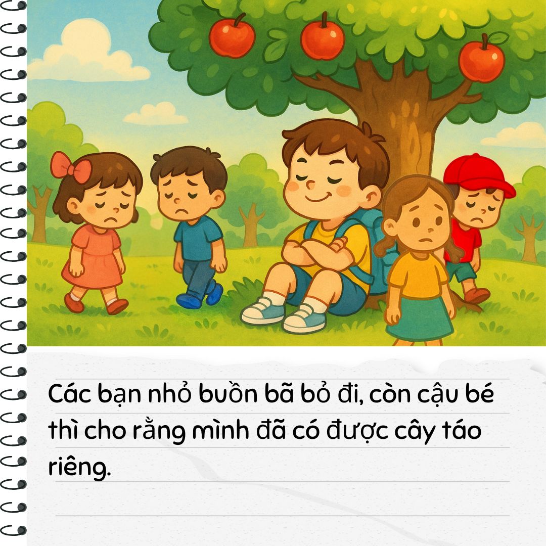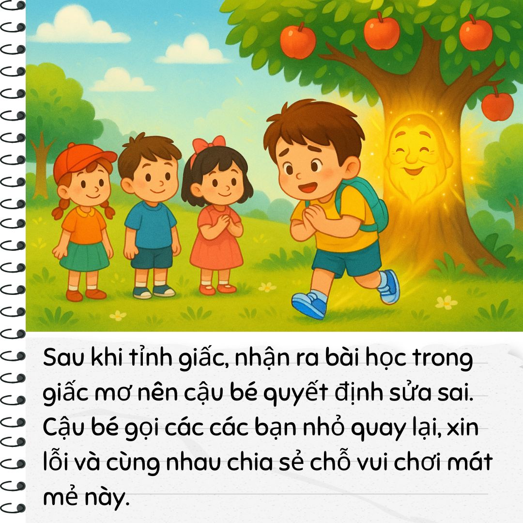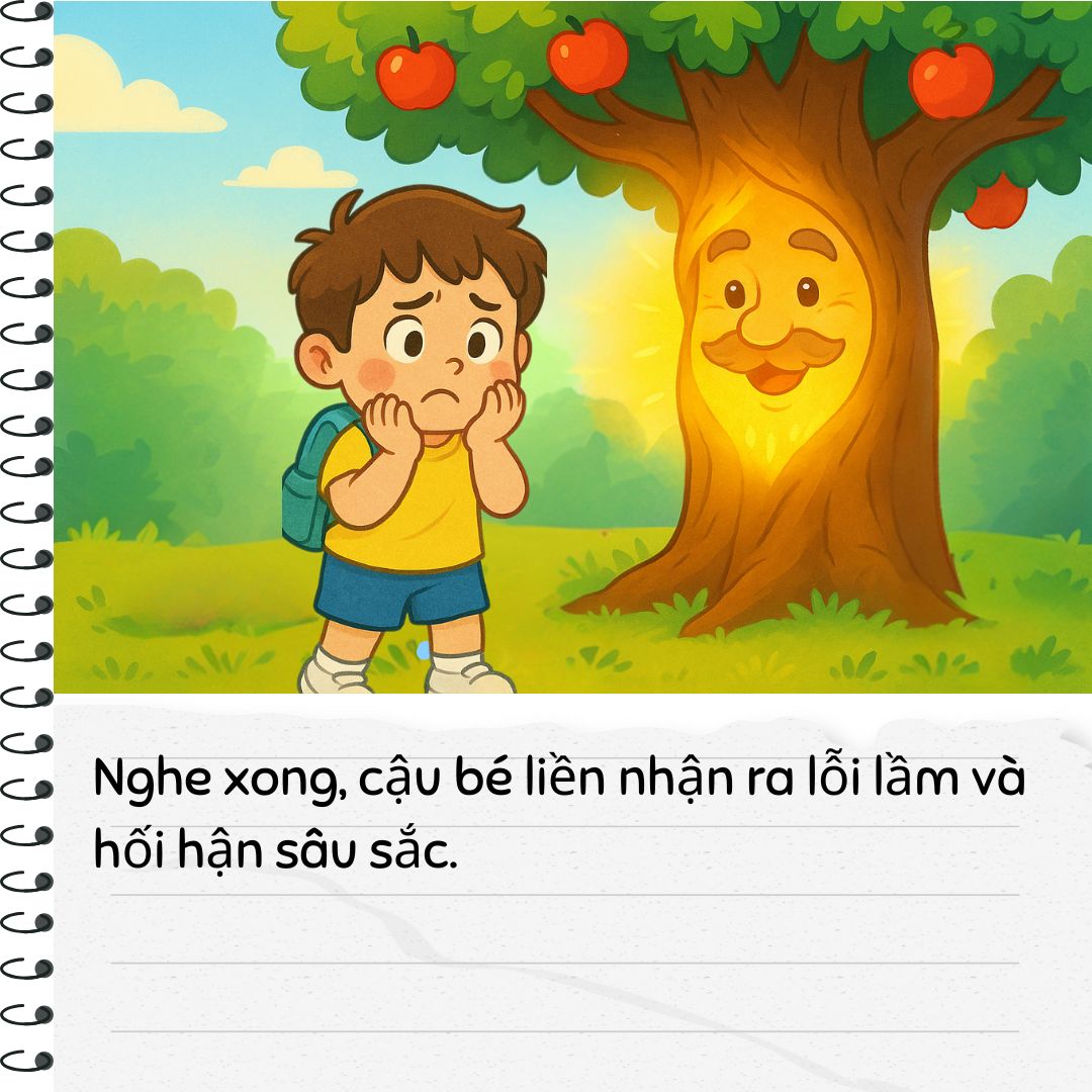 Cậu bé nhớ lại lúc các bạn buồn rầu ra về, cậu bé thấy ân hận vô cùng. Cậu bé ngước nhìn cây táo và nói: