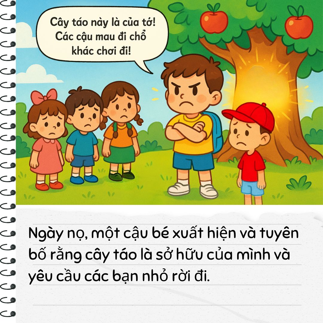 – Này chúng mày, vườn này là của tao, tao đã mua từ trước. Cây táo này của tao, chúng mày đi chỗ khác mà chơi. Cấm không được đến đây nữa.