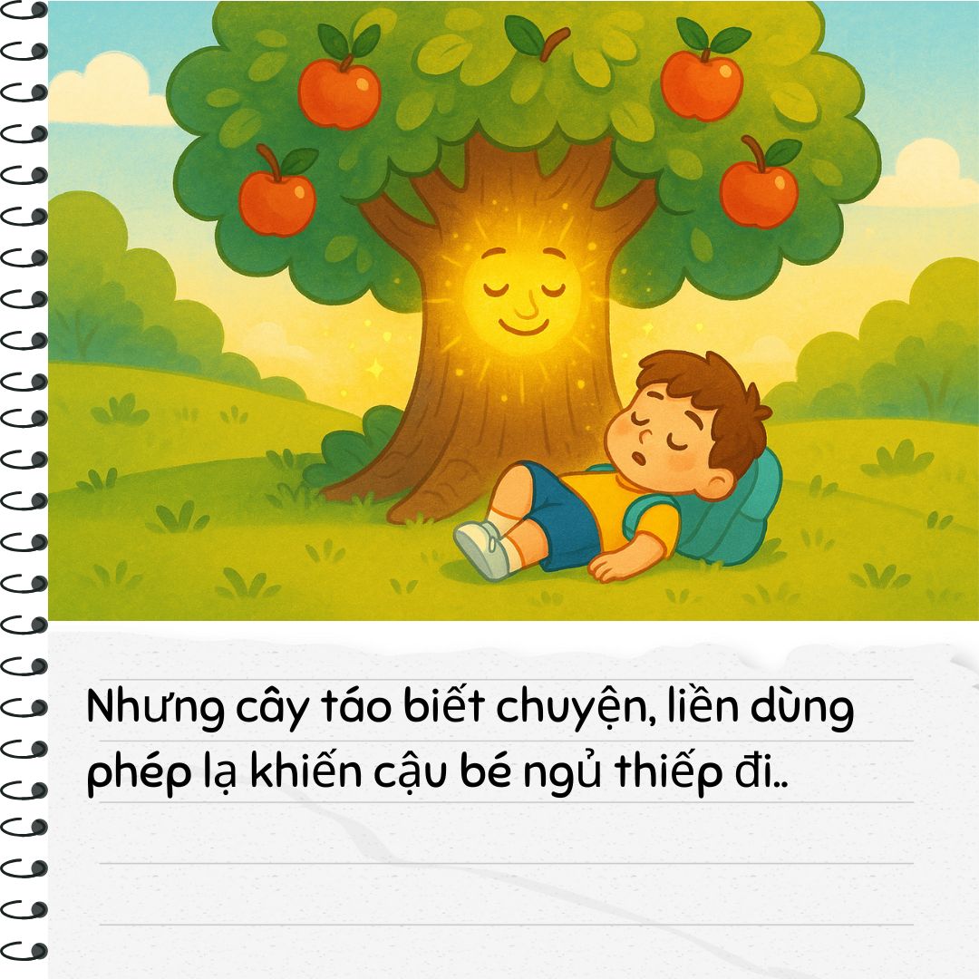 – Vâng cháu biết lỗi rồi! Cây táo cất tiếng cười vang, rung cả cây, làm cho quả táo còn lại rơi trúng đầu cậu bé, cậu bé giật mình tỉnh giấc.