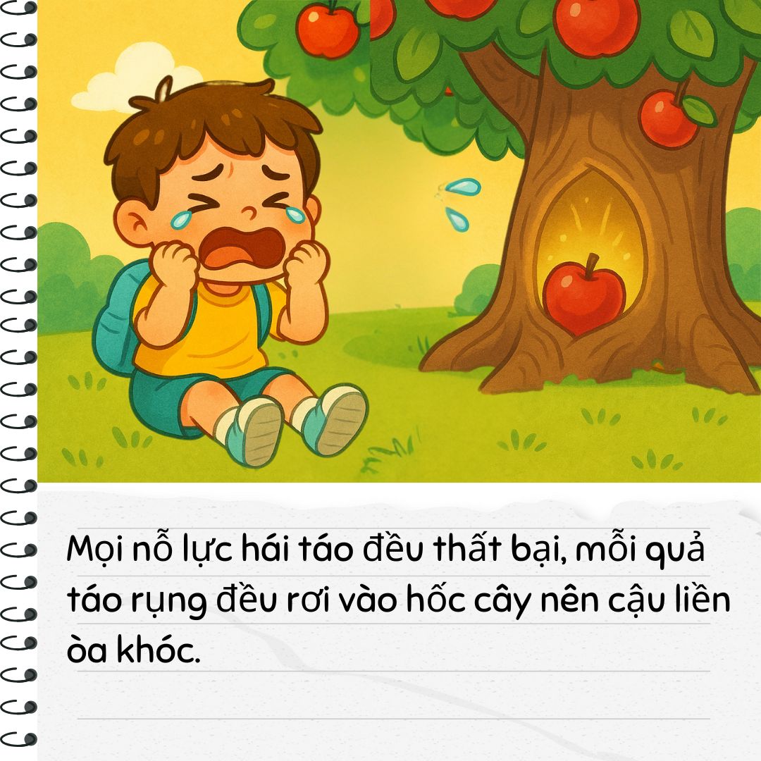 Cậu bé ngồi dưới gốc cây và khóc. Đến lúc đó cây táo mới cất tiếng hỏi: