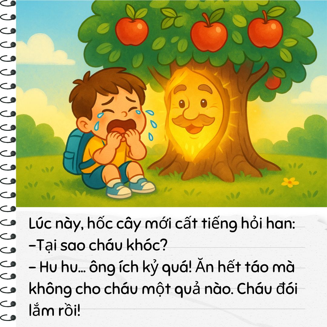 – Ông ích kỷ quá. Ông ăn hết cả táo, ông không cho cháu một quả nào. Cháu đói lắm rồi, ông ạ.