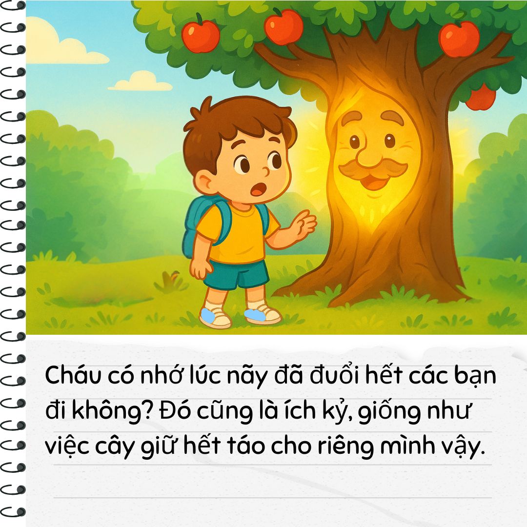 – Cháu có nhớ là cháu đã đuổi hết các bạn không? Các bạn cũng muốn ăn táo của ông nhưng cháu không cho các bạn một quả nào, như vậy cháu có ích kỷ không?