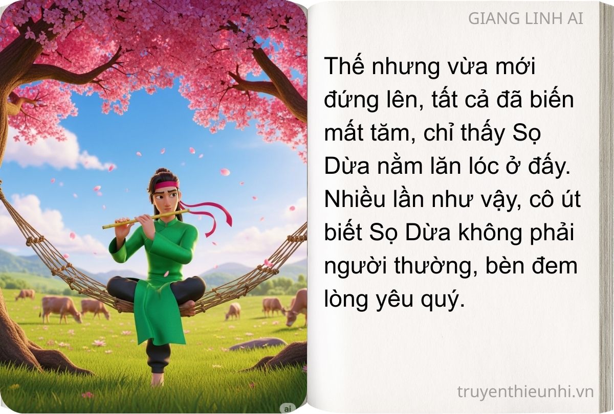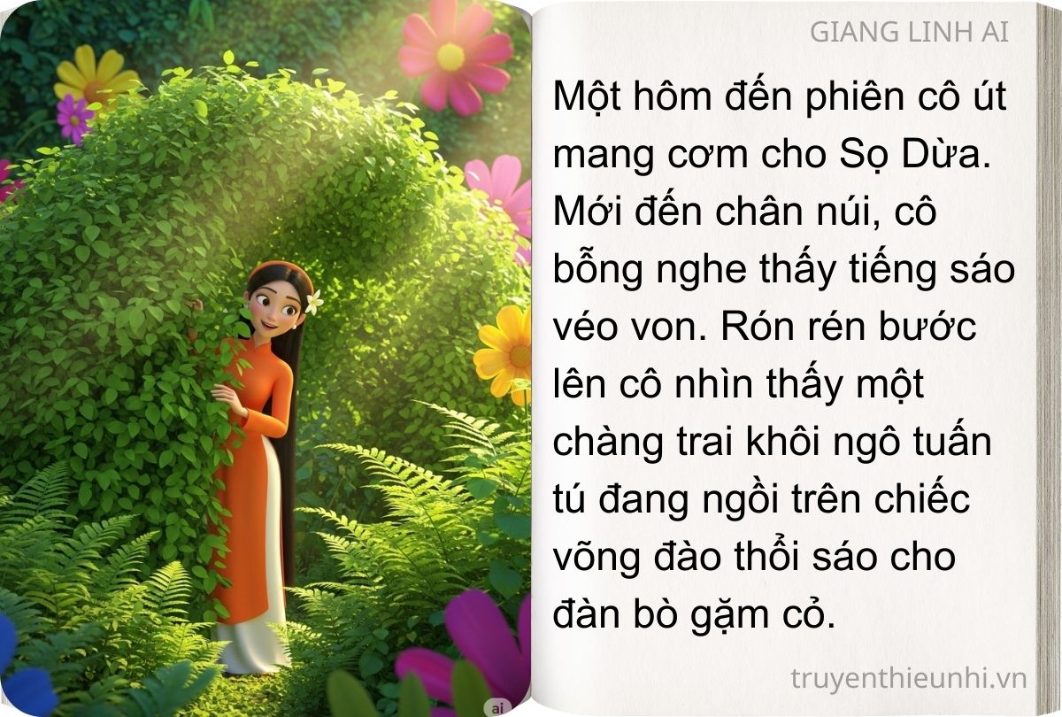 Một hôm đến phiên cô út mang cơm cho Sọ Dừa. Mới đến chân núi, cô bỗng nghe thấy tiếng sáo véo von. Rón rén bước lên cô nhìn thấy một chàng trai khôi ngô tuấn tú đang ngồi trên chiếc võng đào thổi sáo cho đàn bò gặm cỏ. Thế nhưng vừa mới đứng lên, tất cả đã biến mất tăm, chỉ thấy Sọ Dừa nằm lăn lóc ở đấy. Nhiều lần như vậy, cô út biết Sọ Dừa không phải người thường, bèn đem lòng yêu quý.