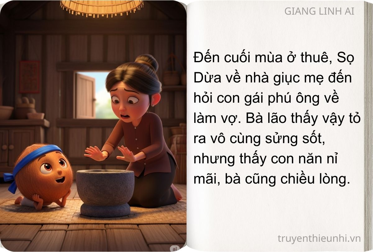 Đến cuối mùa ở thuê, Sọ Dừa về nhà giục mẹ đến hỏi con gái phú ông về làm vợ. Bà lão thấy vậy tỏ ra vô cùng sửng sốt, nhưng thấy con năn nỉ mãi, bà cũng chiều lòng.