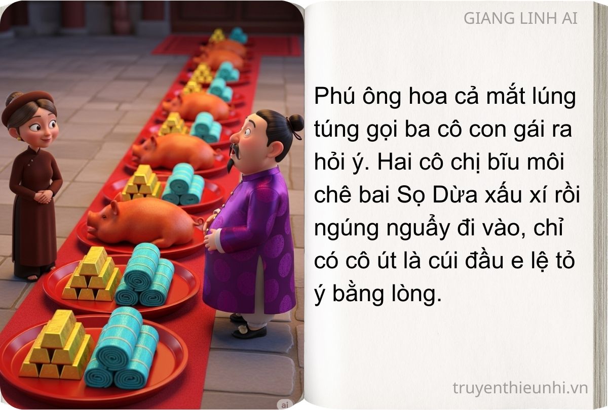 Bà lão đành ra về, nghĩ là phải thôi hẳn việc lấy vợ cho con. Chẳng ngờ, đúng ngày hẹn, bỗng dưng trong nhà có đầy đủ mọi sính lễ, lại có cả gia nhân ở dưới nhà chạy lên khiêng lễ vật sang nhà của phú ông. Phú ông hoa cả mắt lúng túng gọi ba cô con gái ra hỏi ý. Hai cô chị bĩu môi chê bai Sọ Dừa xấu xí rồi ngúng nguẩy đi vào, chỉ có cô út là cúi đầu e lệ tỏ ý bằng lòng.