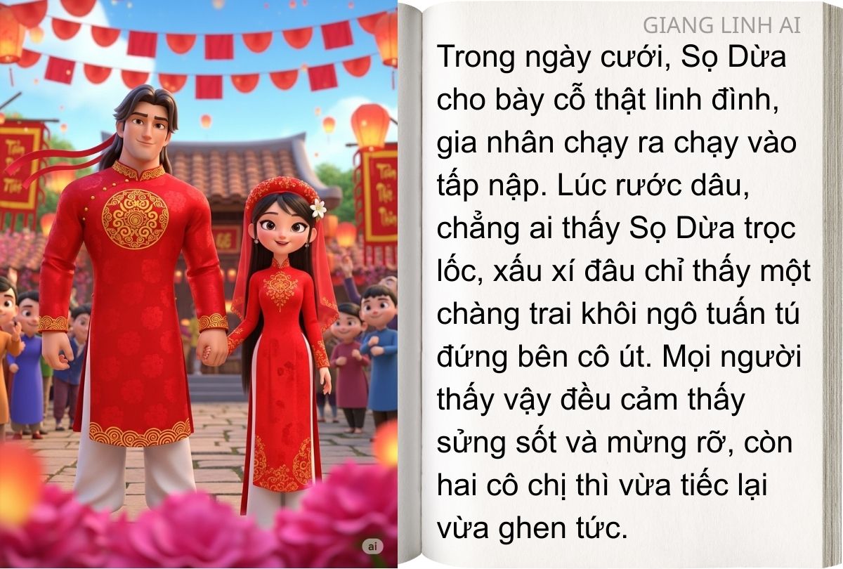 Trong ngày cưới, Sọ Dừa cho bày cỗ thật linh đình, gia nhân chạy ra chạy vào tấp nập. Lúc rước dâu, chẳng ai thấy Sọ Dừa trọc lốc, xấu xí đâu chỉ thấy một chàng trai khôi ngô tuấn tú đứng bên cô út. Mọi người thấy vậy đều cảm thấy sửng sốt và mừng rỡ, còn hai cô chị thì vừa tiếc lại vừa ghen tức.