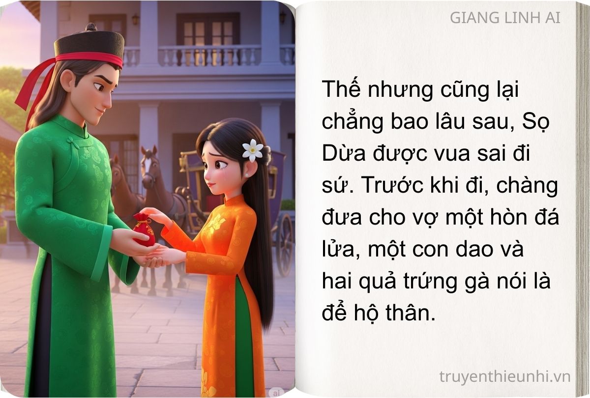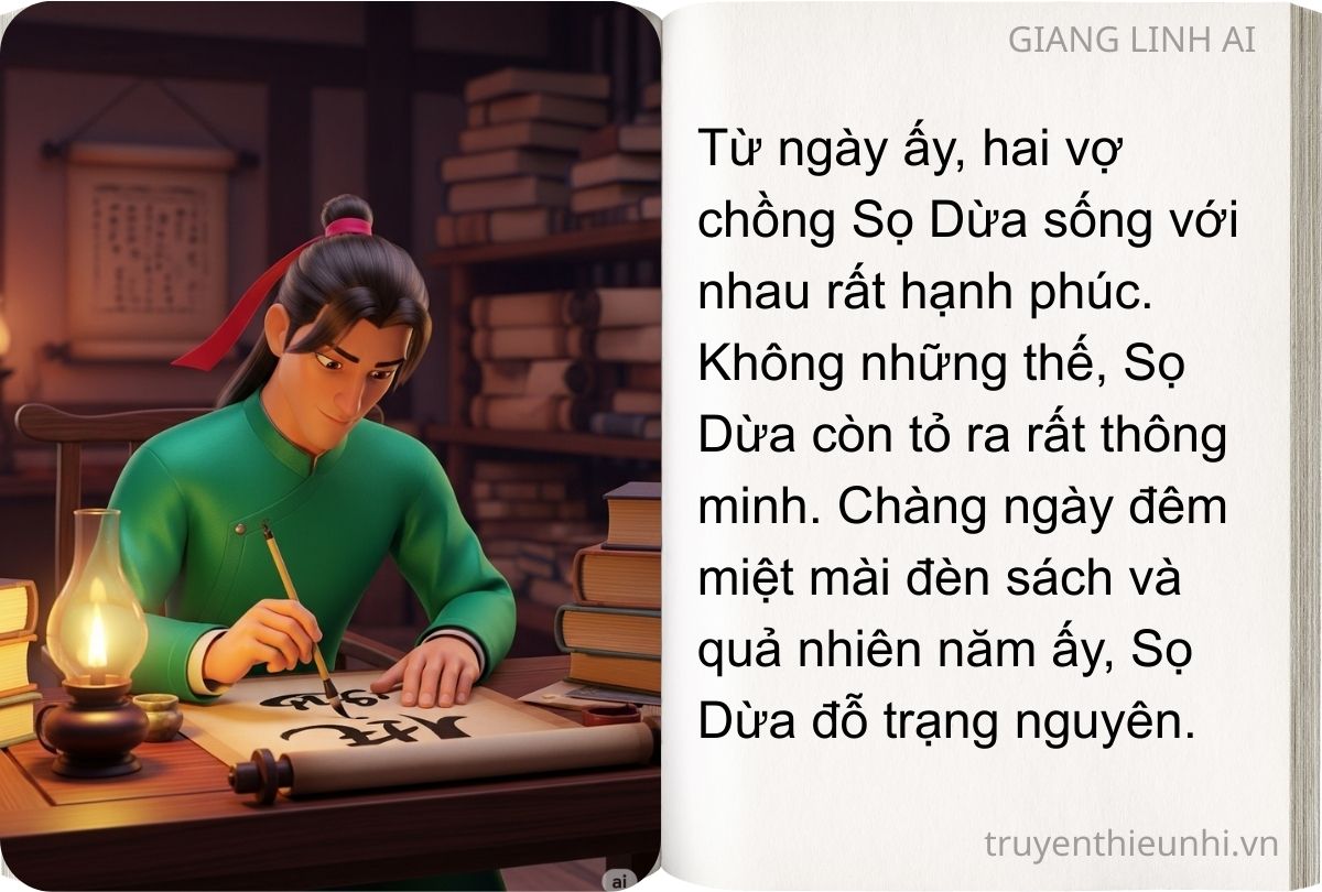 Từ ngày ấy, hai vợ chồng Sọ Dừa sống với nhau rất hạnh phúc. Không những thế, Sọ Dừa còn tỏ ra rất thông minh. Chàng ngày đêm miệt mài đèn sách và quả nhiên năm ấy, Sọ Dừa đỗ trạng nguyên. Thế nhưng cũng lại chẳng bao lâu sau, Sọ Dừa được vua sai đi sứ. Trước khi đi, chàng đưa cho vợ một hòn đá lửa, một con dao và hai quả trứng gà nói là để hộ thân.