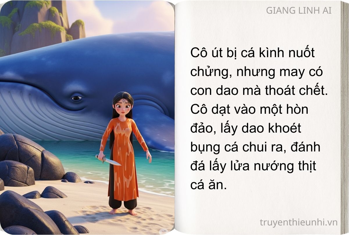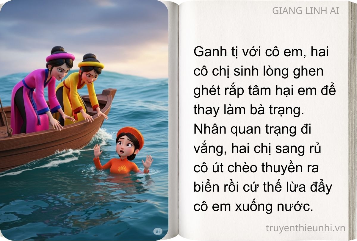 Ganh tị với cô em, hai cô chị sinh lòng ghen ghét rắp tâm hại em để thay làm bà trạng. Nhân quan trạng đi vắng, hai chị sang rủ cô út chèo thuyền ra biển rồi cứ thế lừa đẩy cô em xuống nước. Cô út bị cá kình nuốt chửng, nhưng may có con dao mà thoát chết. Cô dạt vào một hòn đảo, lấy dao khoét bụng cá chui ra, đánh đá lấy lửa nướng thịt cá ăn. Sống được ít ngày trên đảo, hai quả trứng gà cũng kịp nở thành một đôi gà đẹp để làm bạn cùng cô út.