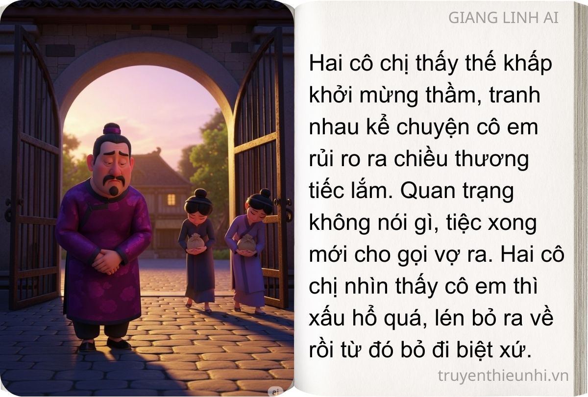 Quan cho thuyền vào xem, chẳng ngờ đó chính là vợ mình. Hai vợ chồng gặp nhau, mừng mừng tủi tủi. Đưa vợ về nhà, quan trạng mở tiệc mừng mời bà con đến chia vui, nhưng lại giấu vợ trong nhà không cho ai biết. Hai cô chị thấy thế khấp khởi mừng thầm, tranh nhau kể chuyện cô em rủi ro ra chiều thương tiếc lắm. Quan trạng không nói gì, tiệc xong mới cho gọi vợ ra. Hai cô chị nhìn thấy cô em thì xấu hổ quá, lén bỏ ra về rồi từ đó bỏ đi biệt xứ.