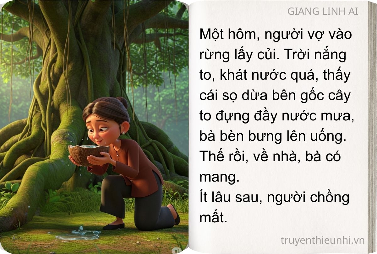 Một hôm, người vợ vào rừng lấy củi. Trời nắng to, khát nước quá, thấy cái sọ dừa bên gốc cây to đựng đầy nước mưa, bà bèn bưng lên uống. Thế rồi, về nhà, bà có mang.