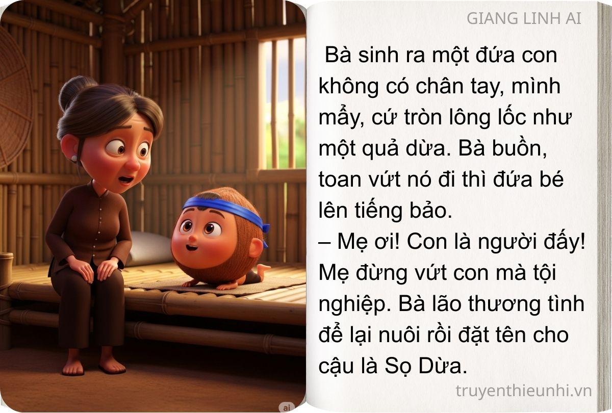 – Mẹ ơi! Con là người đấy! Mẹ đừng vứt con mà tội nghiệp. Bà lão thương tình để lại nuôi rồi đặt tên cho cậu là Sọ Dừa.
