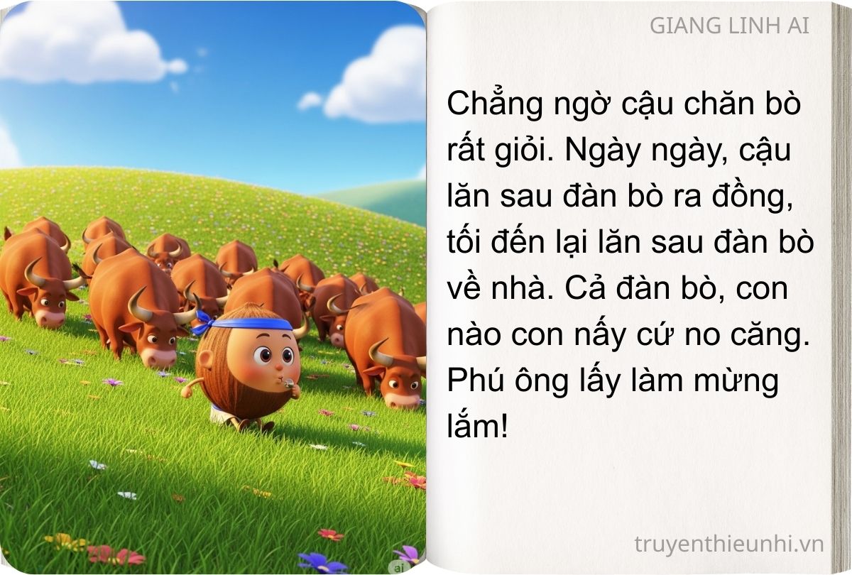 Nghe nói đến Sọ Dừa, phú ông ngần ngại. Nhưng nghĩ: nuôi nó thì ít tốn cơm, công sá lại chẳng đáng là bao, phú ông đồng ý. Chẳng ngờ cậu chăn bò rất giỏi. Ngày ngày, cậu lăn sau đàn bò ra đồng, tối đến lại lăn sau đàn bò về nhà. Cả đàn bò, con nào con nấy cứ no căng. Phú ông lấy làm mừng lắm!