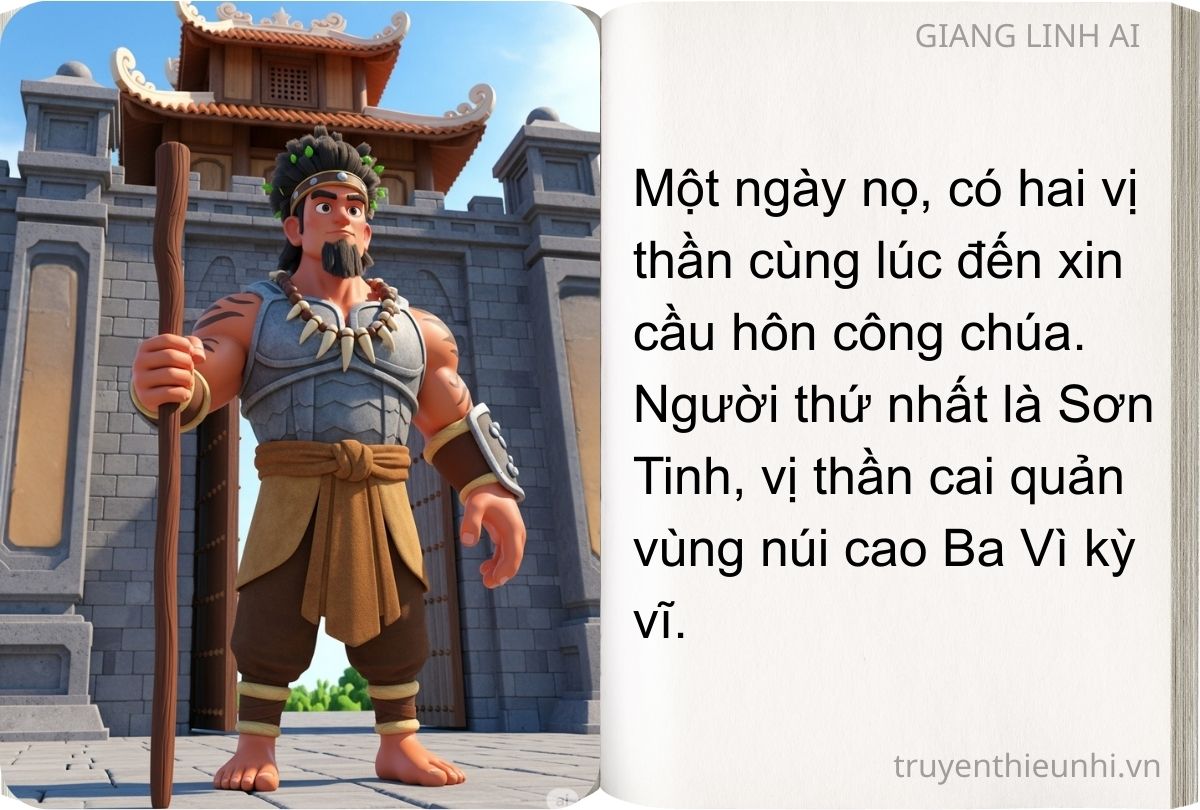 Một hôm có hai chàng trai đến, xin ra mắt nhà vua để cầu hôn. Một người ở vùng núi Ba Vì, tuấn tú và tài giỏi khác thường: chỉ tay về phía đông, phía đông biến thành đồng lúa xanh, chỉ tay về phía tây, phía tây mọc lên hàng dãy núi. Nhân dân trong vùng gọi chàng là Sơn Tinh. Còn một người ở mãi tận miền biển Đông tài giỏi cũng không kém: gọi gió, gió đến, hò ma, ma tới – Chàng này tên gọi là Thủy Tinh.
