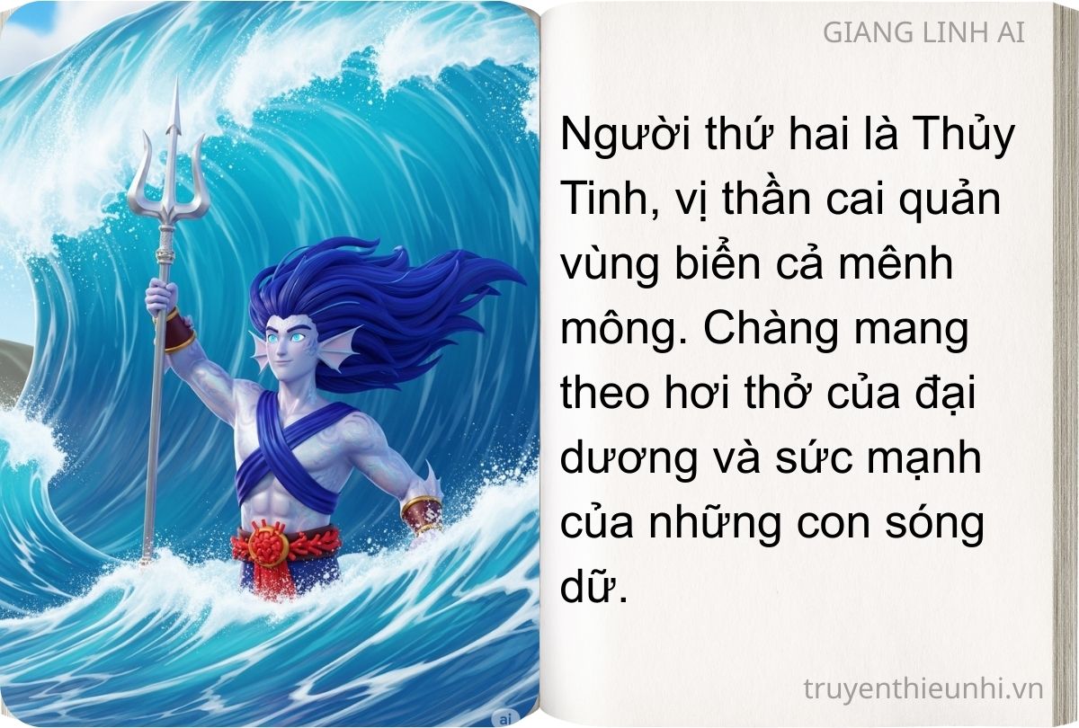 Thủy Tinh hô ma, gọi gió, làm thành dông bão đùng đùng rung chuyển cả đất trời, dâng nước sông lên cuồn cuộn tiến đánh Sơn Tinh. Nước ngập lúa, ngập đồng rồi ngập nhà, ngập cửa.