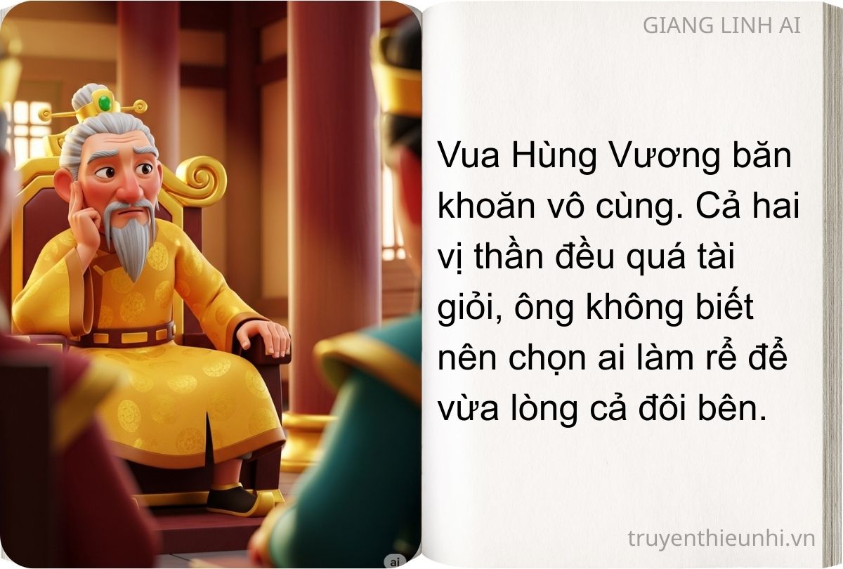 Một người là chúa của miền non cao, một người là chúa của vùng nước thẳm, cả hai đều xứng đáng làm rể vua Hùng cả. Hùng Vương băn khoăn không biết nhận lời ai, từ chối ai. Nhà vua cho mời các quan lạc hầu vào bàn mà vẫn không tìm được kế hay. Cuối cùng, Hùng Vương phán rằng: