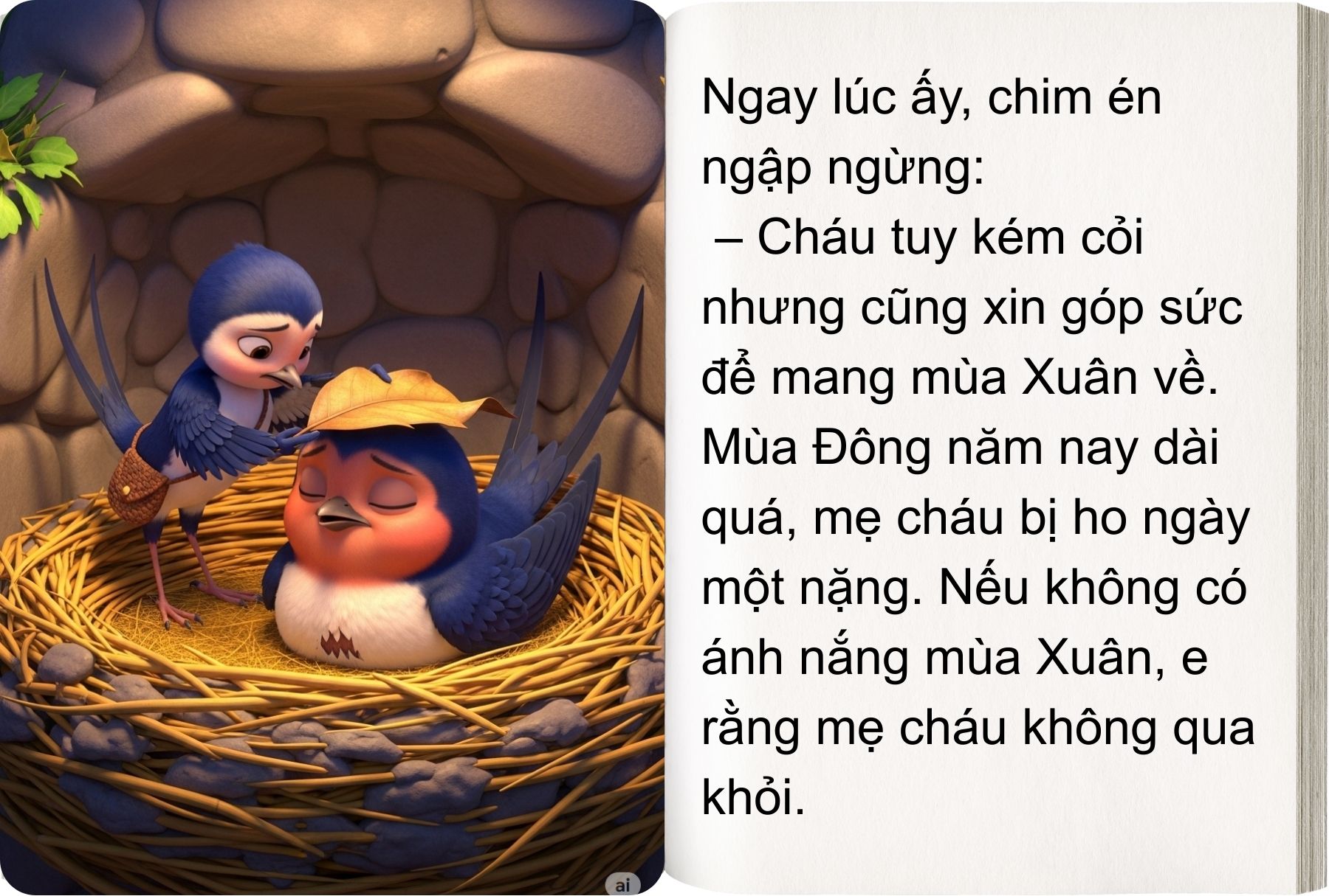 Đến lúc này, muông thú đã sốt ruột lắm rồi. Nếu còn chần chừ sẽ trễ mất mùa Xuân tuyệt vời. Ngay lúc ấy, chim én ngập ngừng: