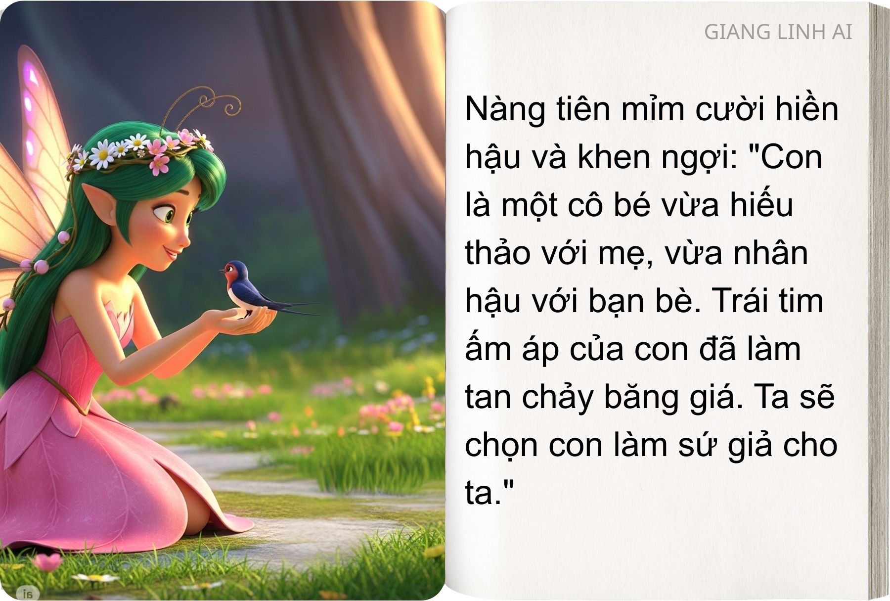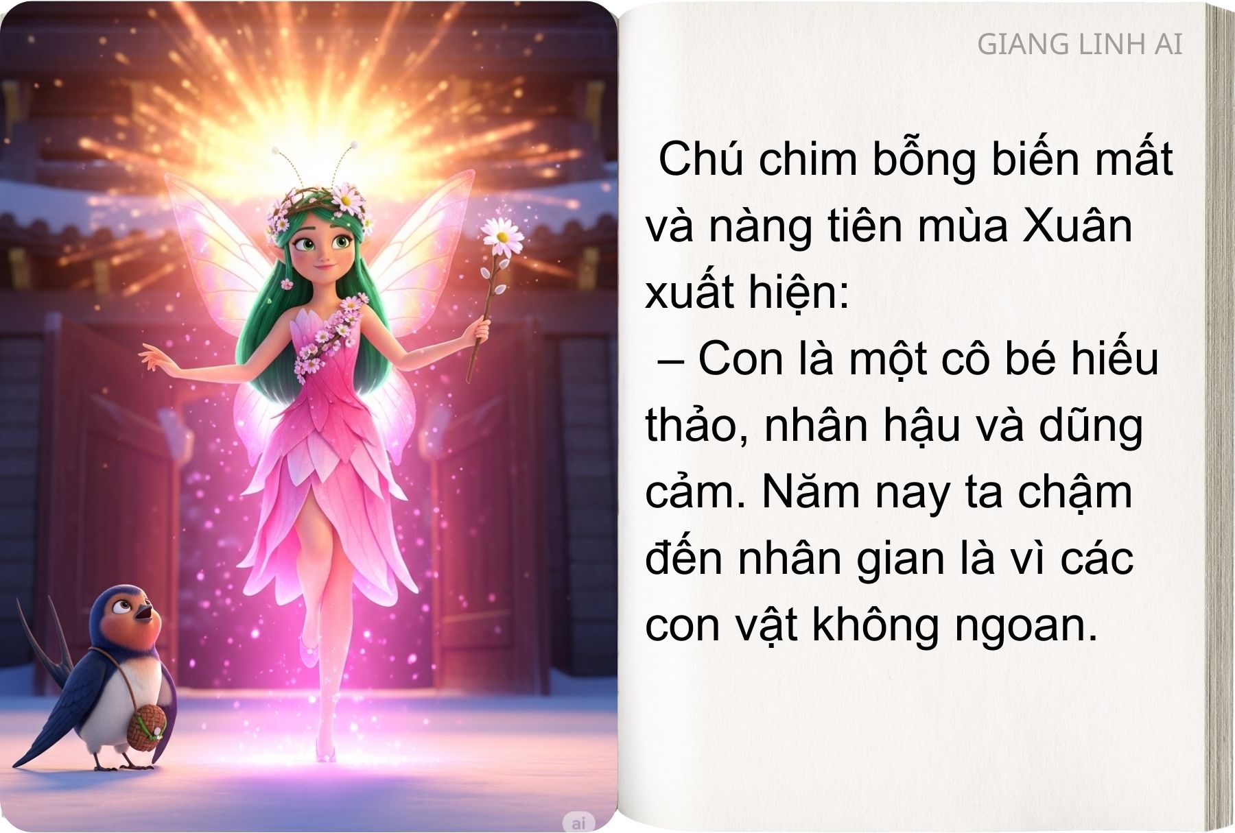 – Con là một cô bé hiếu thảo, nhân hậu và dũng cảm. Năm nay ta chậm đến nhân gian là vì các con vật không ngoan. Chúng không biết yêu thương và giúp đỡ nhau. Nhờ có con ta biết rằng điều tốt đẹp vẫn còn hiện hữu. Ta sẽ chọn con làm sứ giả cho ta.
