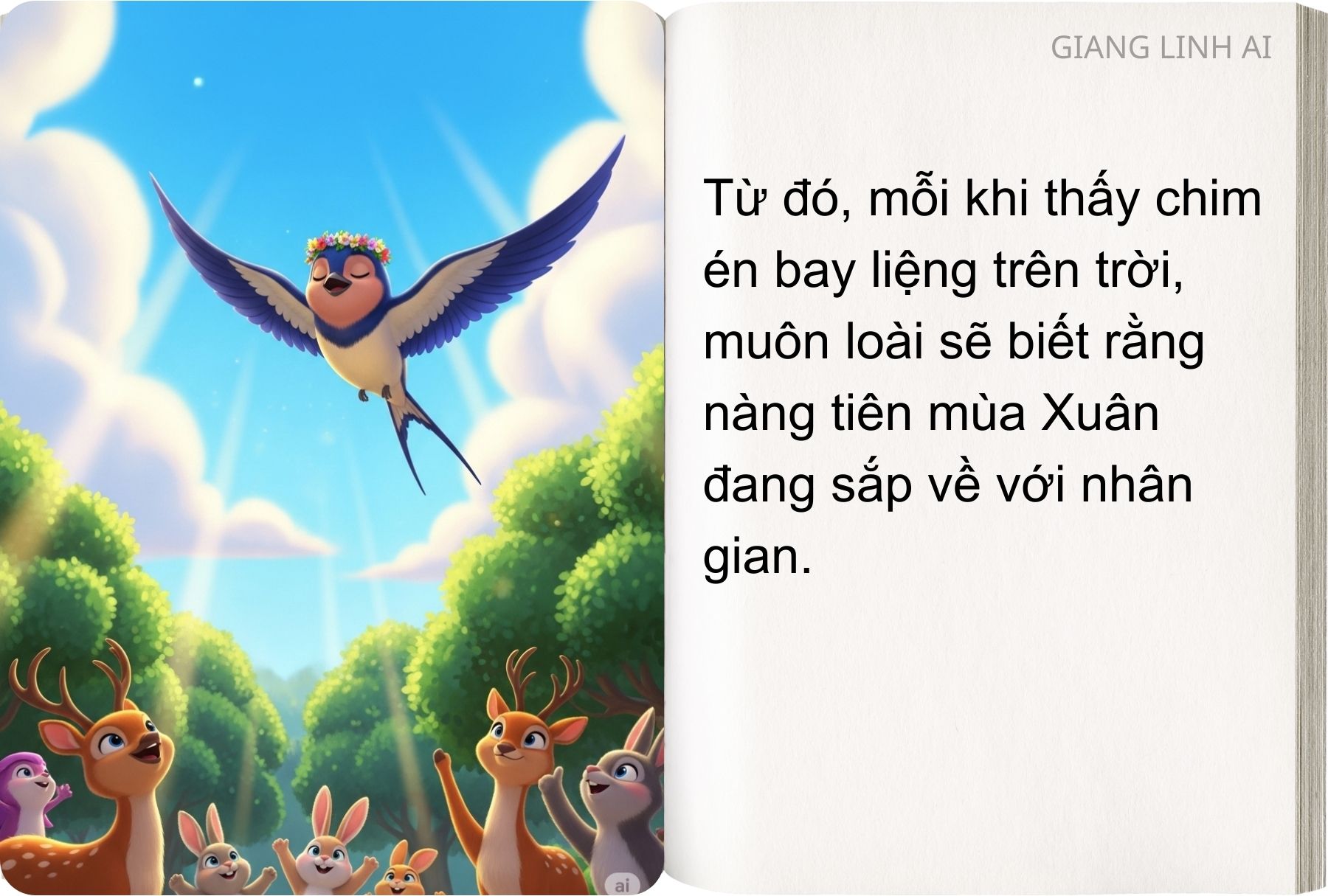 Từ đó, mỗi khi thấy chim én bay liệng trên trời, muôn loài sẽ biết rằng nàng tiên mùa Xuân đang sắp về với nhân gian.