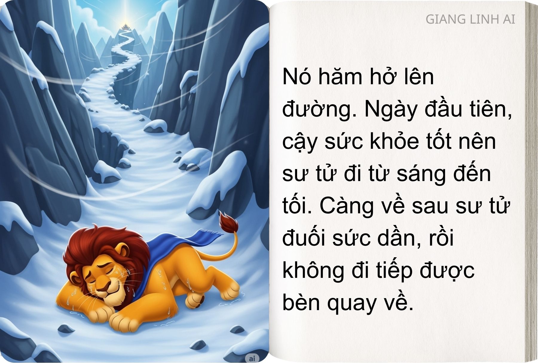 Vì thế, các con vật mở cuộc họp chọn người đi đón nàng tiên mùa Xuân và tìm hiểu nguyên do. Sư tử tự nhận mình khỏe mạnh, dũng cảm nhất nên giành quyền đi đón nàng tiên mùa Xuân. Nó hăm hở lên đường. Ngày đầu tiên, cậy sức khỏe tốt nên sư tử đi từ sáng đến tối. Càng về sau sư tử đuối sức dần, rồi không đi tiếp được bèn quay về.