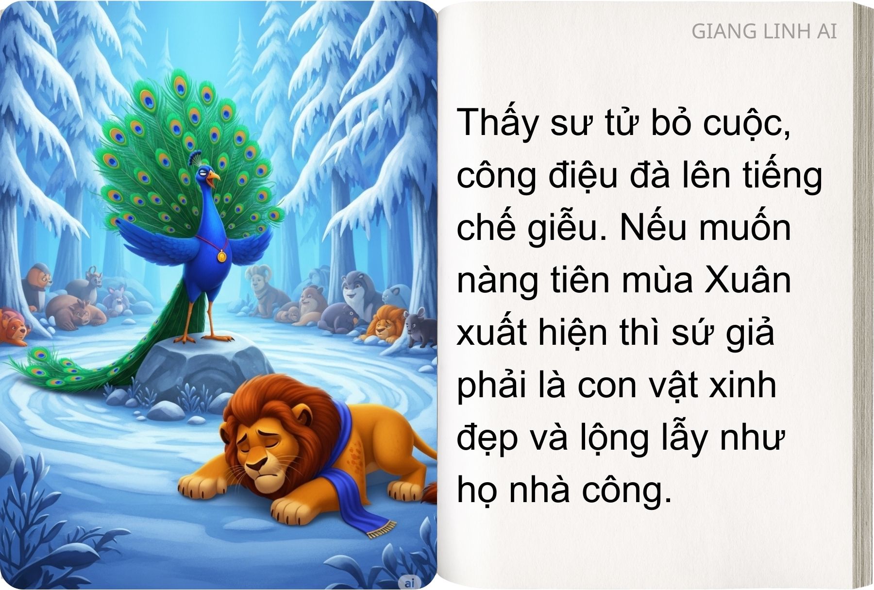 Thấy sư tử bỏ cuộc, công điệu đà lên tiếng chế giễu. Nếu muốn nàng tiên mùa Xuân xuất hiện thì sứ giả phải là con vật xinh đẹp và lộng lẫy như họ nhà công. Các con vật đồng ý cử chim công đi thực hiện nhiệm vụ. Chim công lên đường cùng đoàn tùy tùng, mang theo nhiều quà và hoa đẹp… Thế nhưng, đường sá xa xôi, vất vả, cả đoàn dần mệt mỏi rồi bị ốm, hoa và quà tặng phải vứt lại trên đường. Cuối cùng, chim công đành quay về.