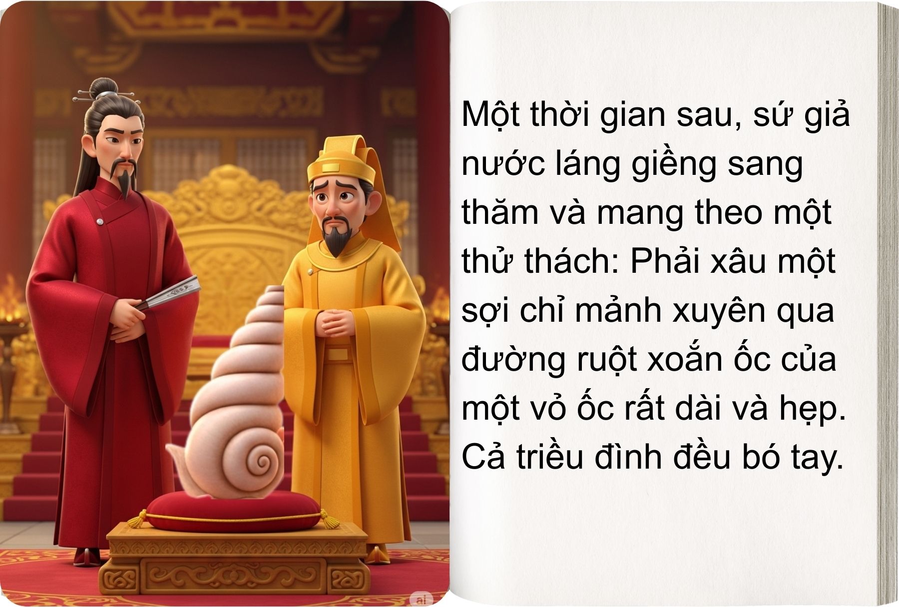 Một nước láng giềng lăm le xâm chiếm bờ cõi của nhà vua, họ đã sai sứ giả mang sang một vỏ ốc dài, rỗng hai đầu và thách đố sâu một sợi chỉ xuyên qua đường ruột ốc.