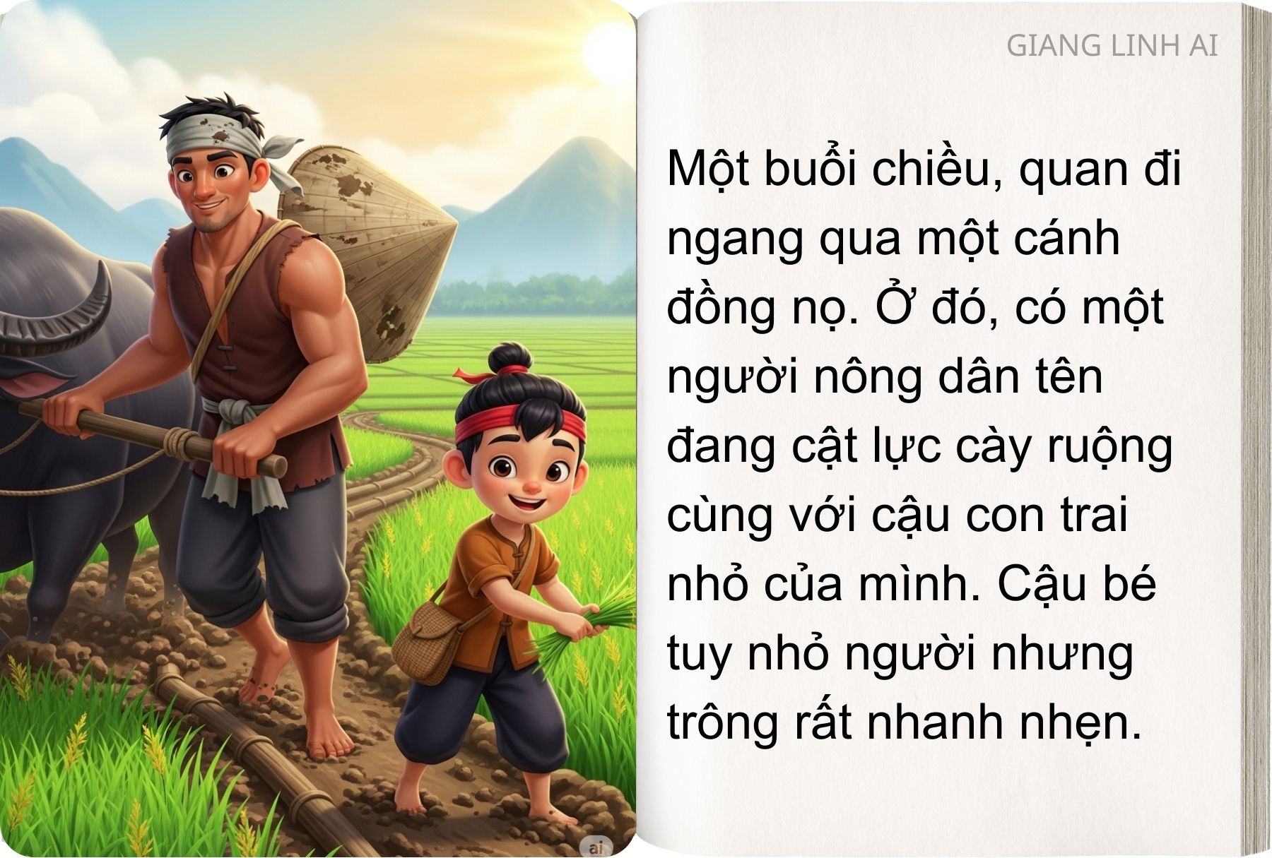Bỗng một hôm, viên quan tình cờ đi qua một cánh đồng làng, ông nhìn thấy bên vệ đường hai cha con đang làm ruộng, người cha thì đánh trâu cày, người con thì đập đất. Ông đã cho dừng ngựa lại để hỏi han: