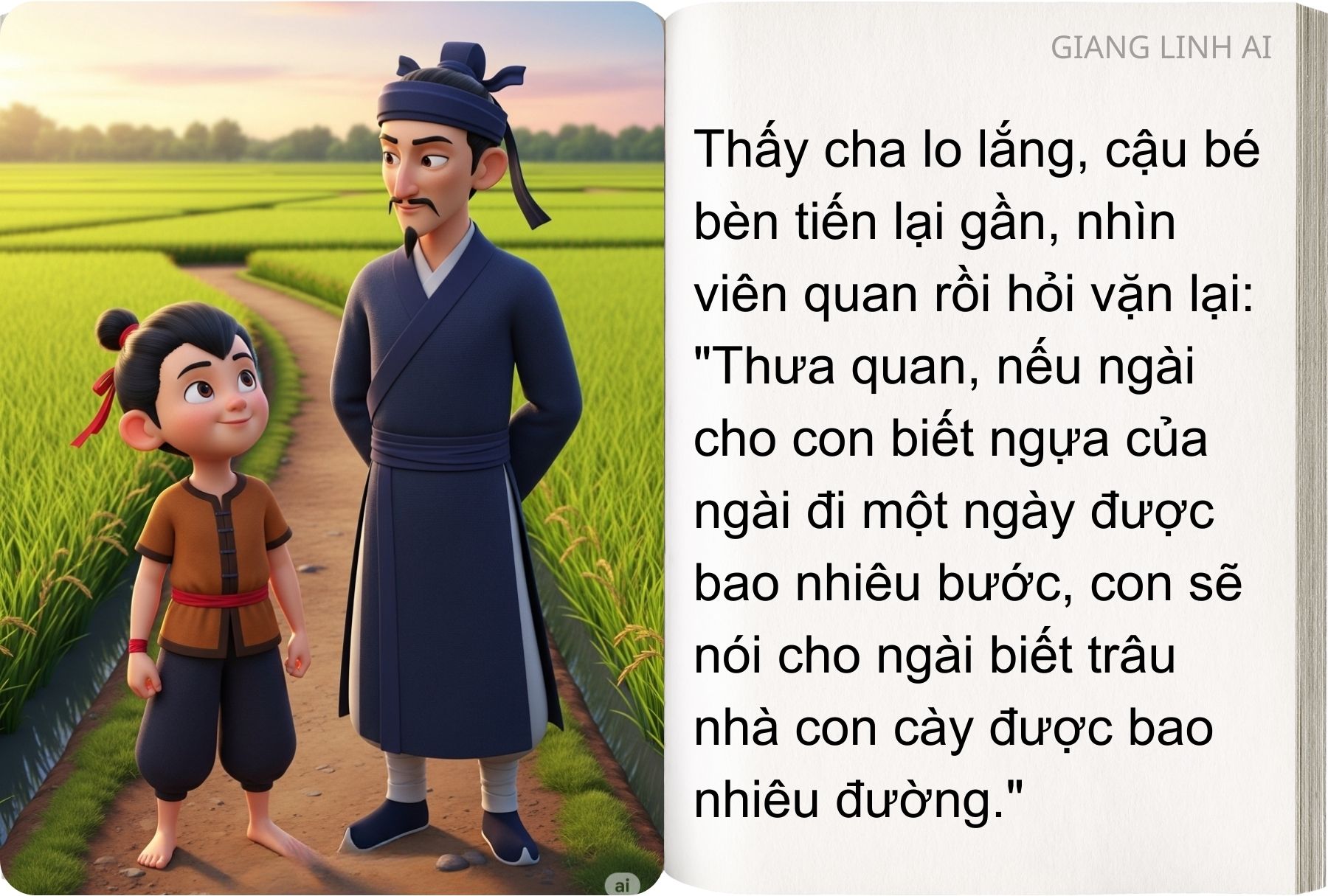 – Tôi xin hỏi ông câu này trước. Nếu ông trả lời được ngựa của ông đi một ngày được mấy bước, tôi sẽ cho ông biết trâu của cha tôi cày một ngày được mấy đường.