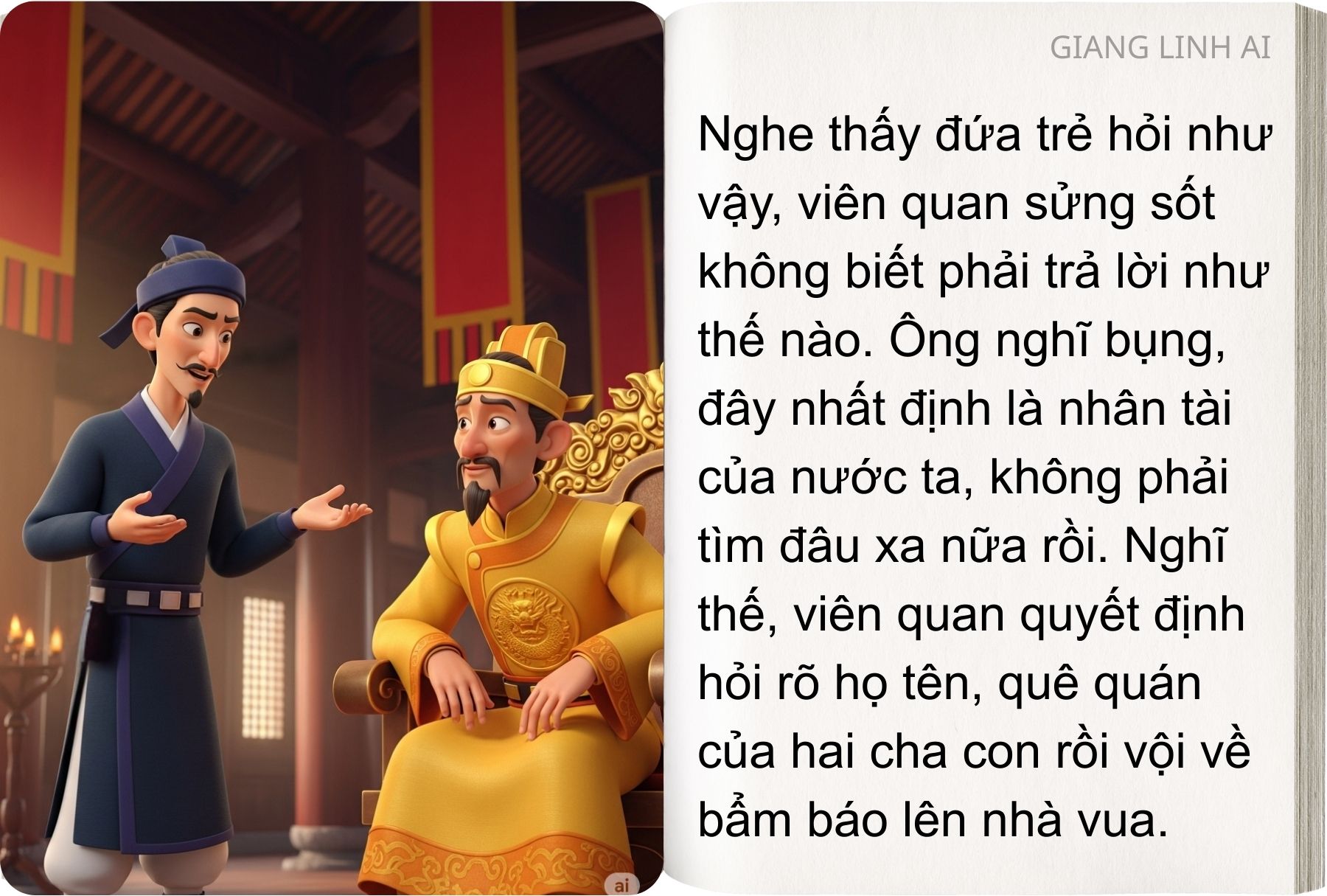 Nghe thấy đứa trẻ hỏi như vậy, viên quan sửng sốt không biết phải trả lời như thế nào. Ông nghĩ bụng, đây nhất định là nhân tài của nước ta, không phải tìm đâu xa nữa rồi. Nghĩ thế, viên quan quyết định hỏi rõ họ tên, quê quán của hai cha con rồi vội về bẩm báo lên nhà vua.