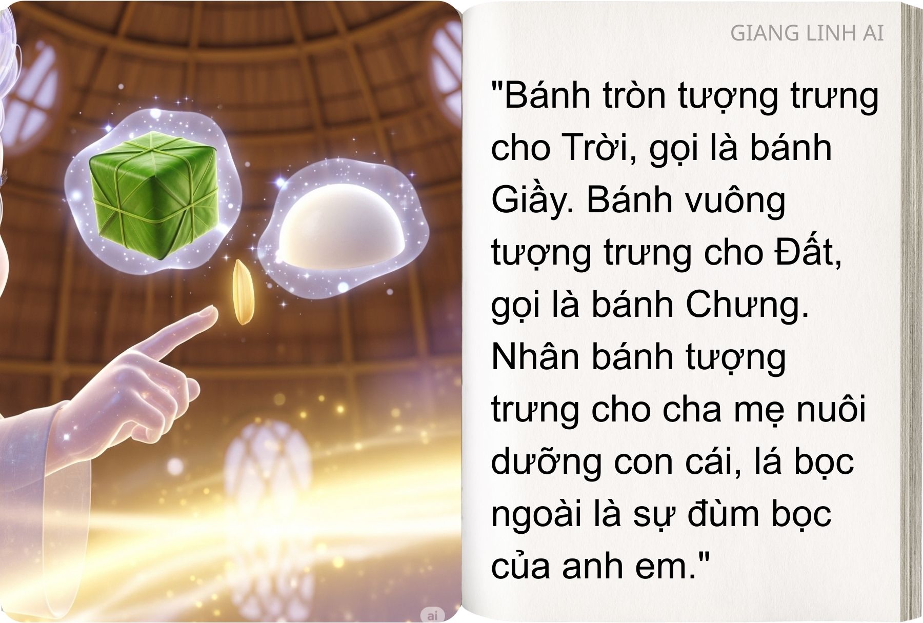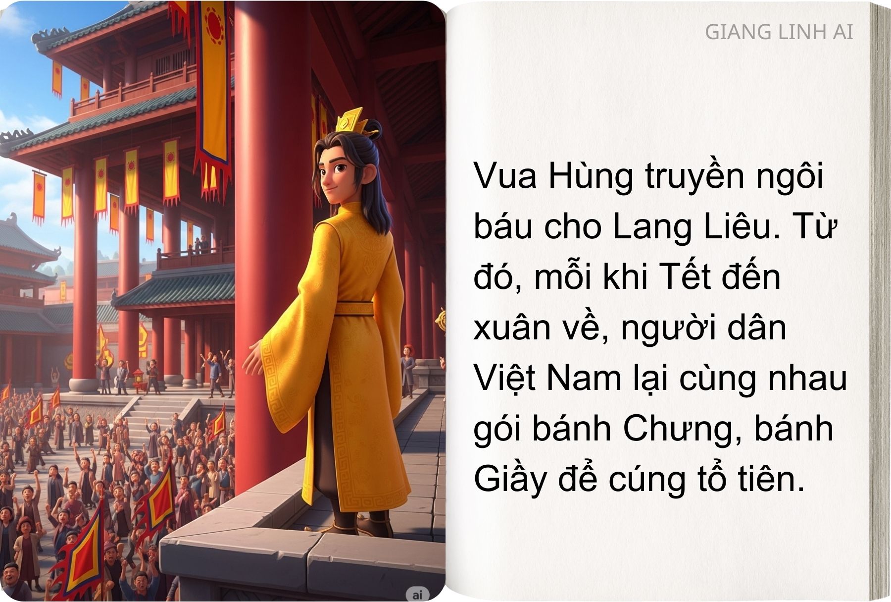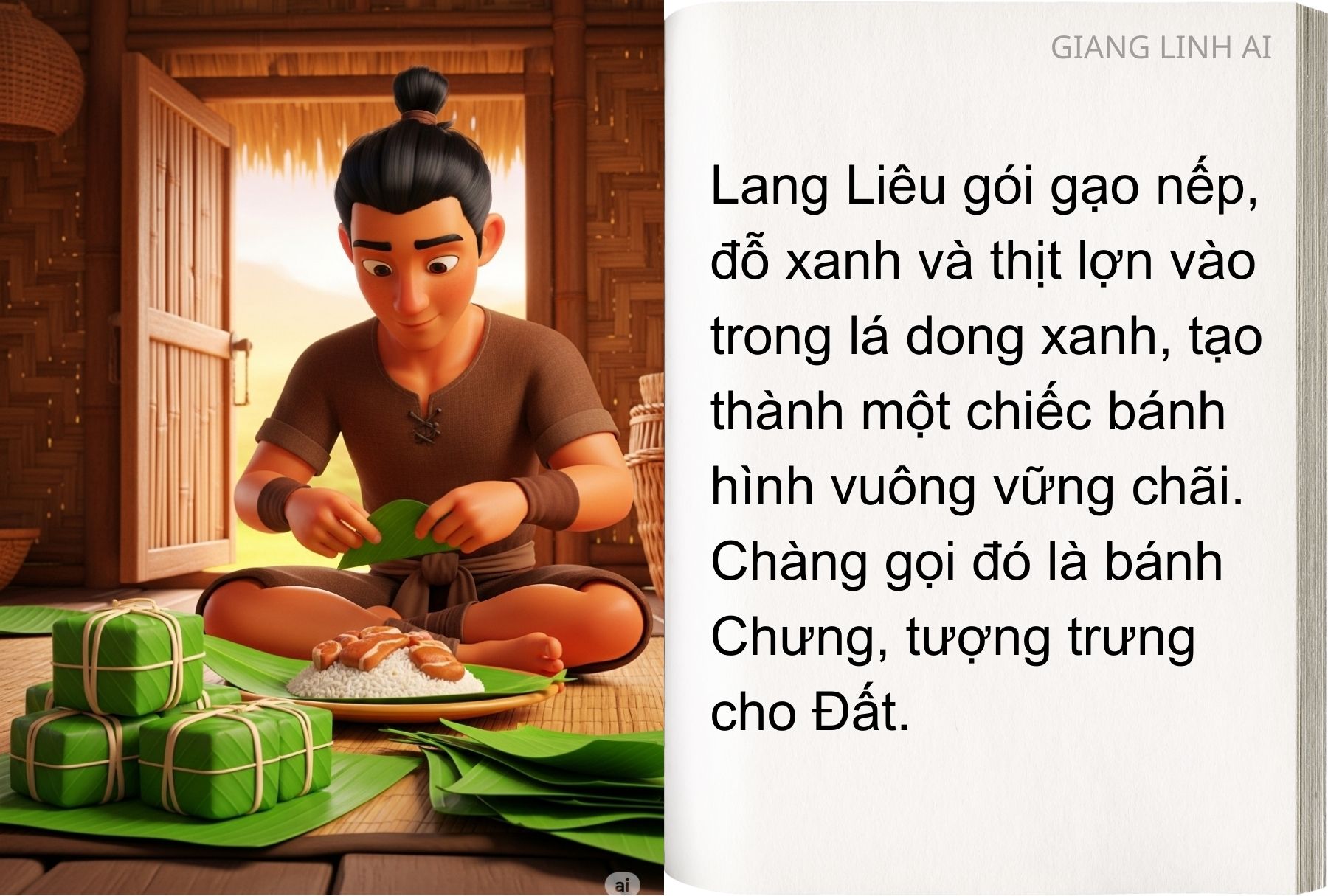 “Sự tích Bánh Chưng – Bánh Giầy” kể về chàng hoàng tử Lang Liêu nghèo khó, bằng tấm lòng chân thành đã sáng tạo nên hai loại bánh giản dị mà sâu sắc để dâng lên vua cha.