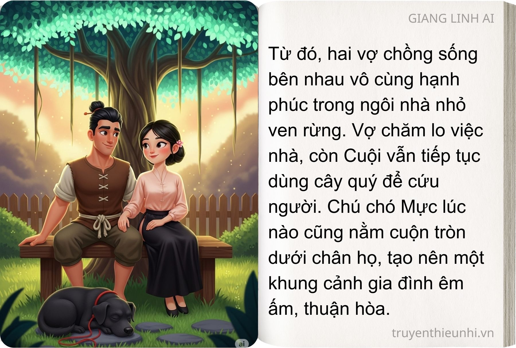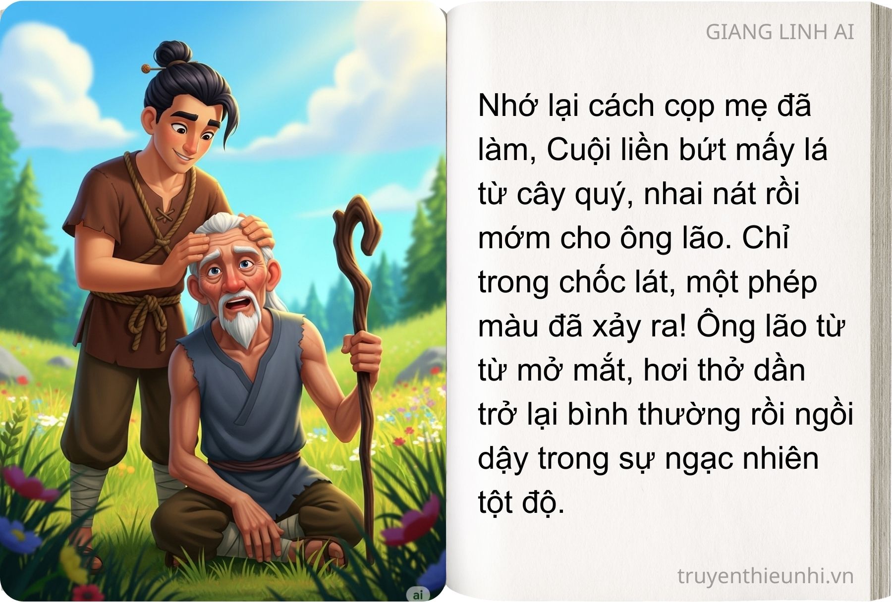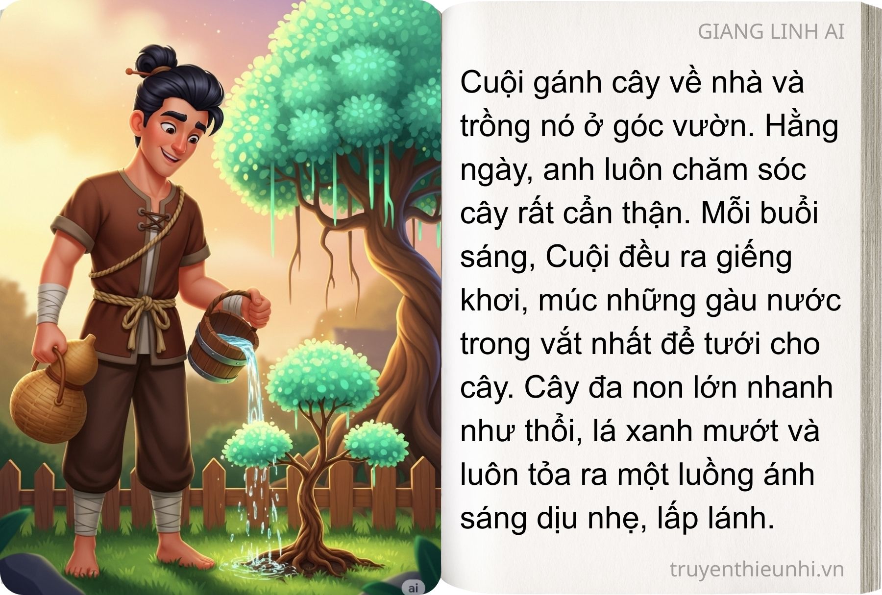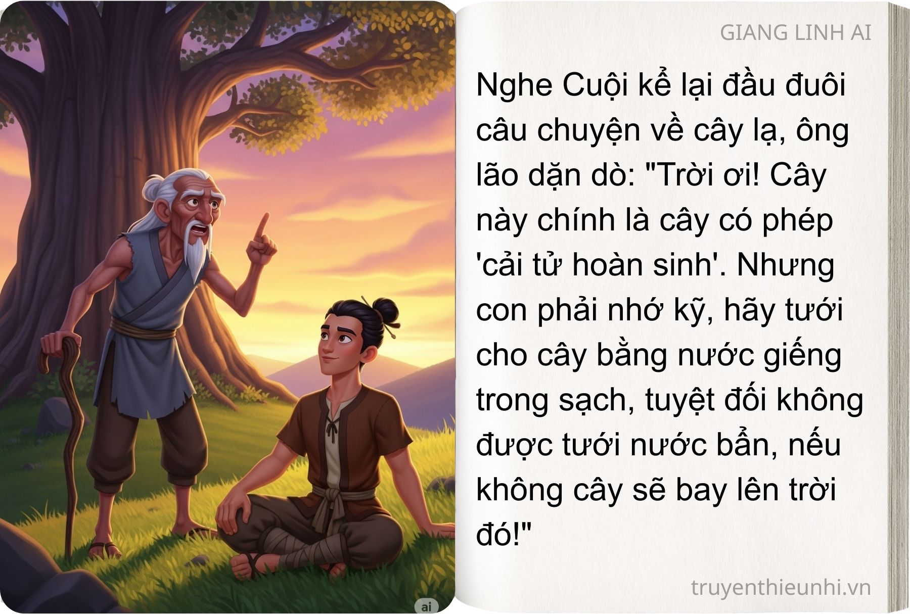 – Trời ơi! Cây này chính là cây có phép “cải tử hoàn sinh” đây. Thật là trời cho con để cứu giúp thiên hạ. Con hãy chăm sóc cho cây nhưng nhớ đừng tưới bằng nước bẩn mà cây bay lên trời đó!