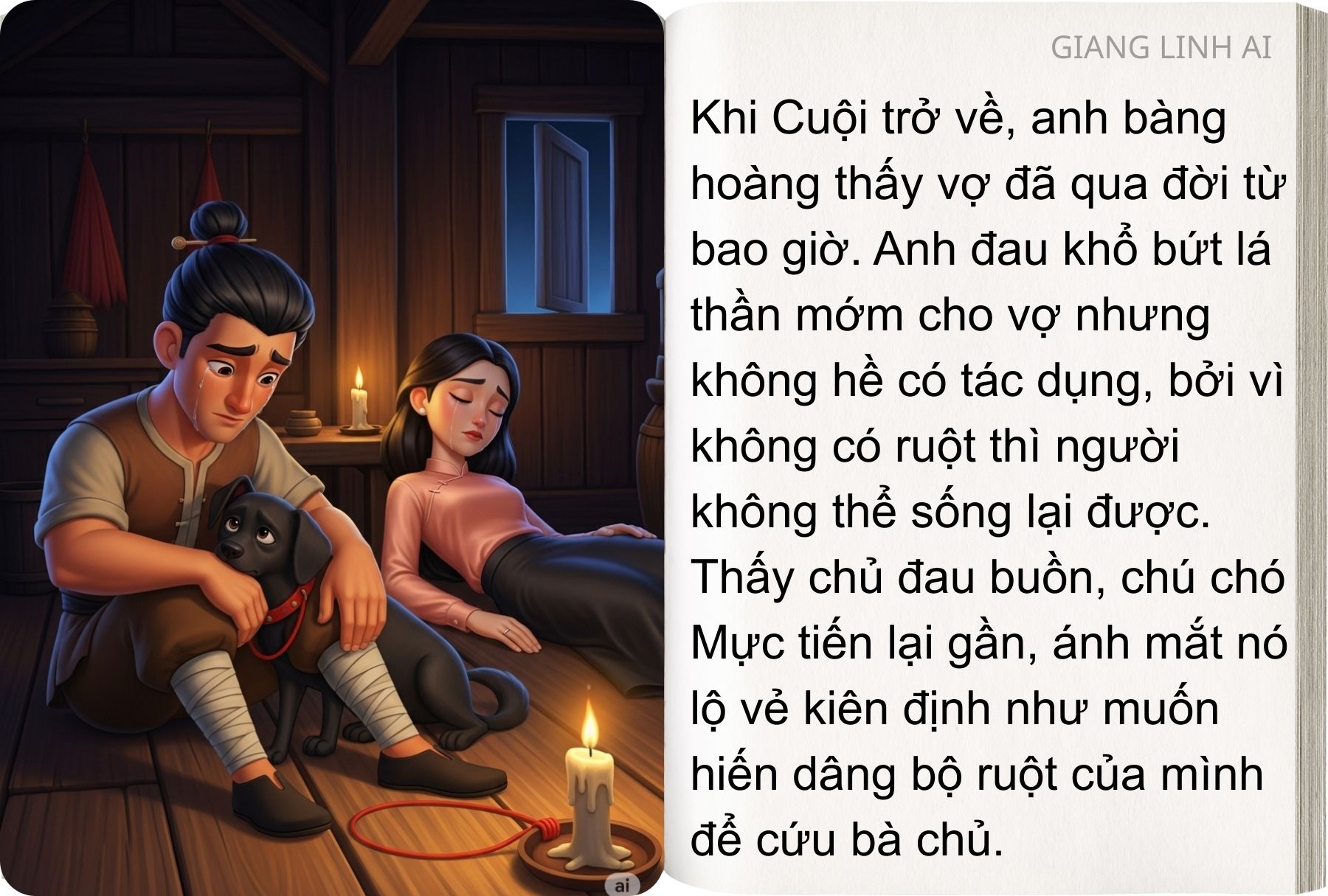 Thấy chủ khóc thảm thiết, con chó lại gần xin hiến ruột mình thay vào ruột vợ chủ. Quả nhiên, người vợ sống lại và vẫn trẻ đẹp như xưa. Thương chú chó của mình, Cuội bèn nặn thử một bộ ruột bằng đất và đặt vào bụng chó, chú chó sau đó cũng được cứu sống. Khi đó, vợ với chồng, người với vật lại càng quấn quít hơn xưa.
