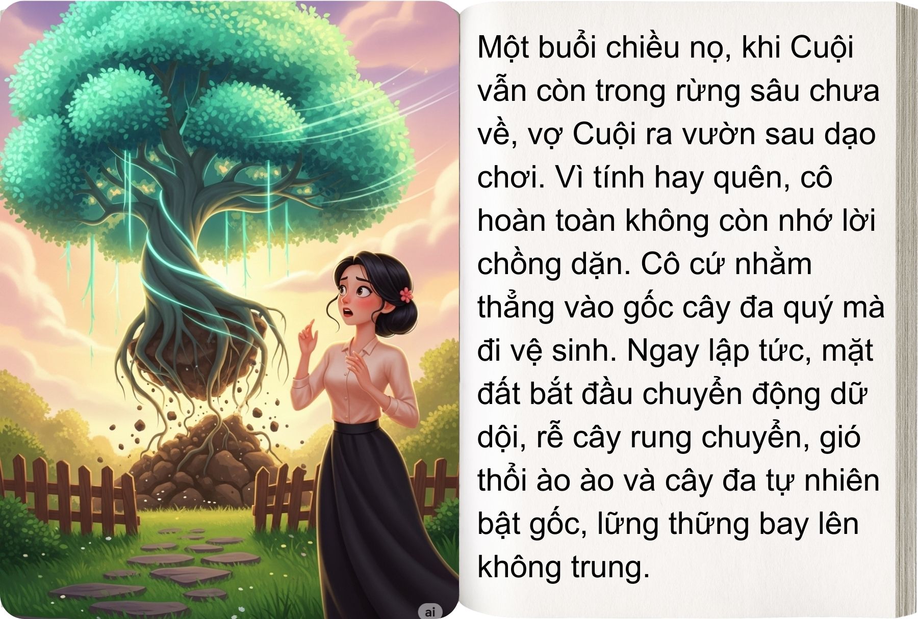 Một buổi chiều, Cuội còn đi rừng kiếm củi chưa về, vợ Cuội ra vườn sau, không còn nhớ lời chồng dặn, cứ nhằm vào gốc cây quý mà đái. Không ngờ người vợ vừa đái xong thì mặt đất chuyển động, cây đảo mạnh, gió thổi ào ào. Cây đa tự nhiên bật gốc, lững thững bay lên trời.