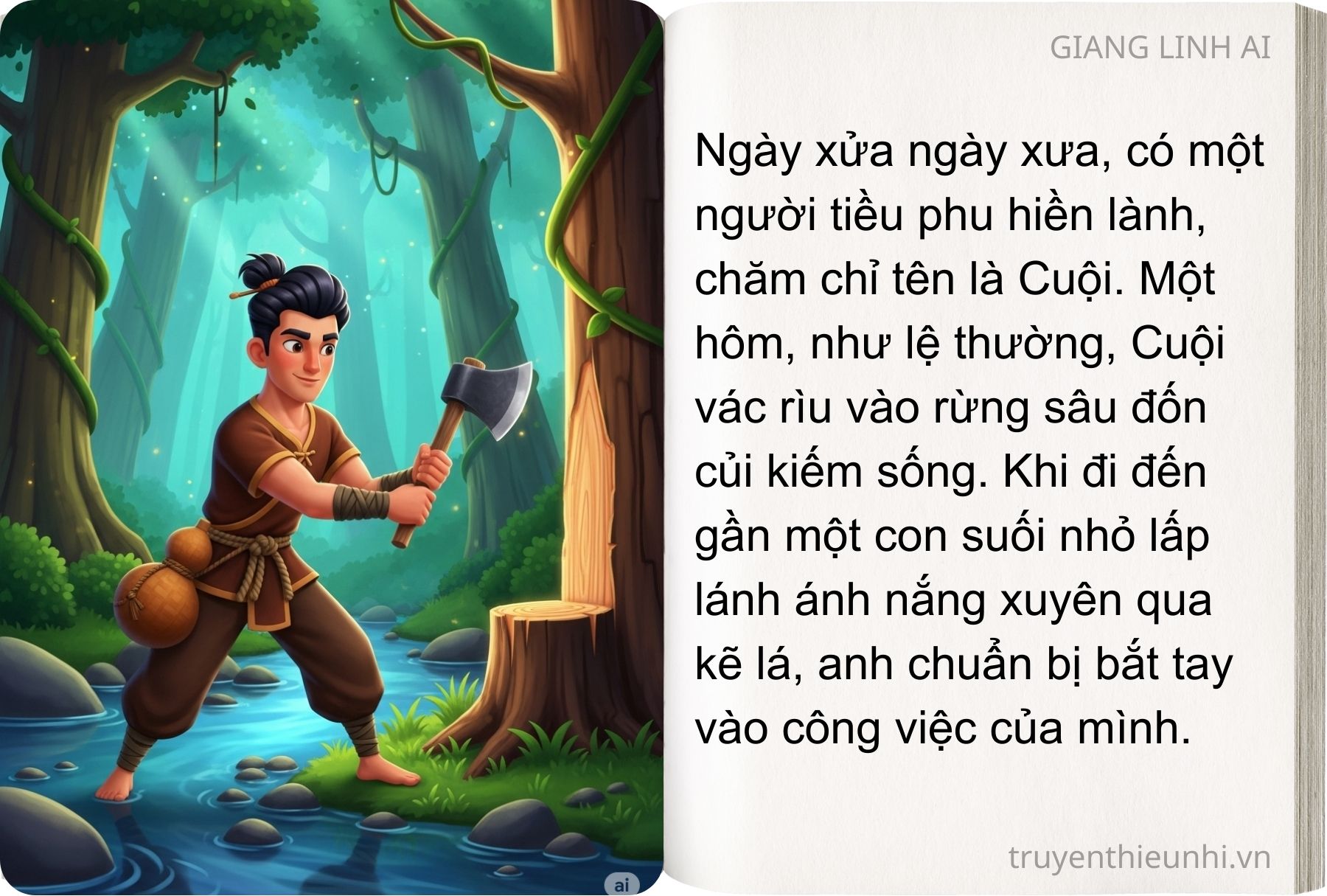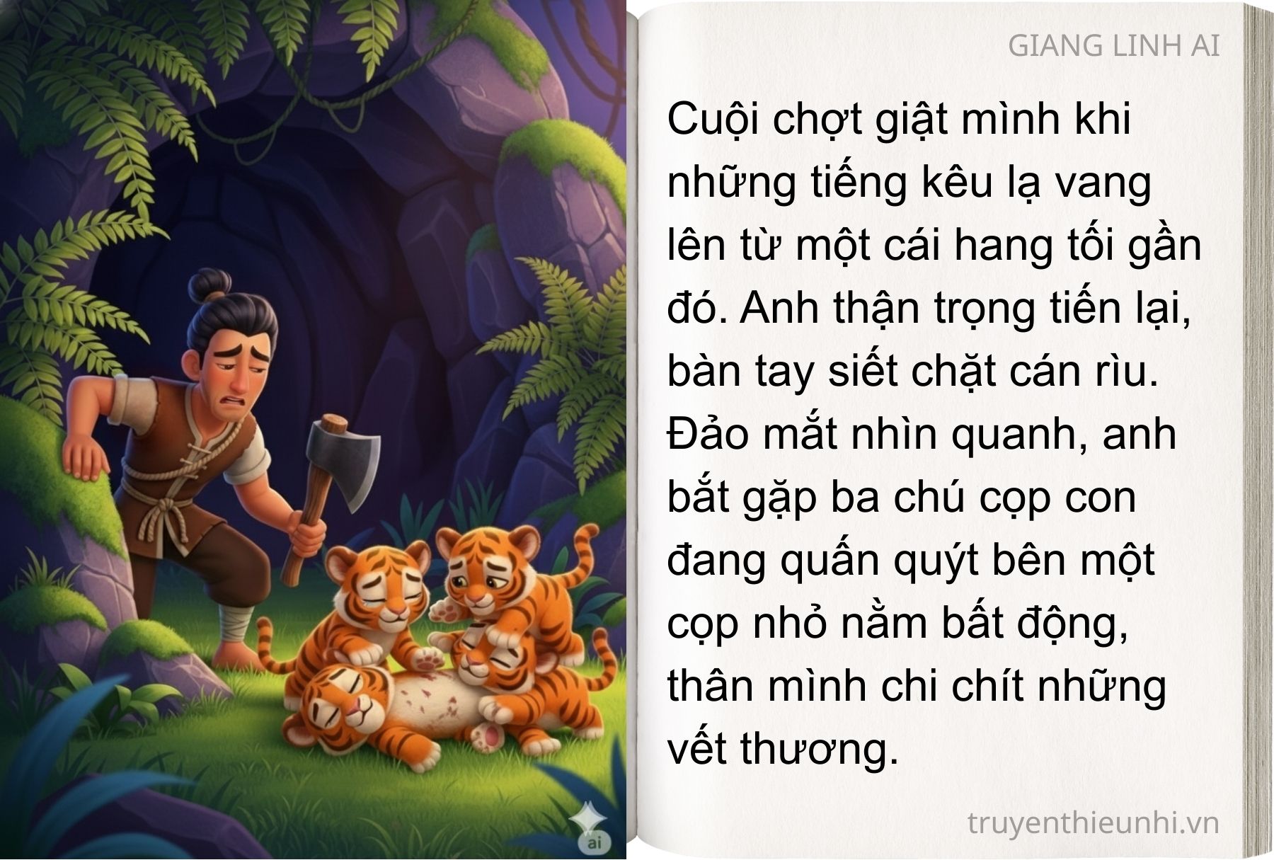Ngày xưa có một người tiều phu tên là Cuội. Một hôm, như lệ thường, Cuội vào rừng chặt cây. Khi đến gần một con suối nhỏ, Cuội bỗng giật mình trông thấy một cái hang cọp. Nhìn trước nhìn sau anh chỉ thấy có bốn con cọp con đang vờn nhau.