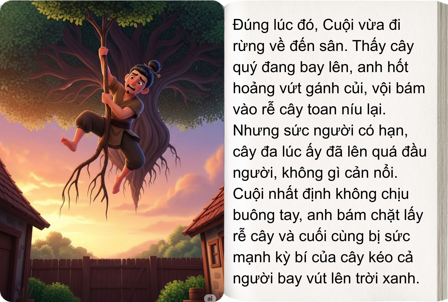 Vừa lúc đó thì Cuội về đến nhà. Thấy thế, Cuội hốt hoảng vứt gánh củi, nhảy bổ đến, móc rìu vào rễ cây toan níu cây lại. Nhưng cây lúc ấy đã rời khỏi mặt đất lên quá đầu người, không một sức nào cản nổi. Cuội cũng nhất định không chịu buông, cuối cùng bị cây kéo cả bay vút lên đến cung trăng.