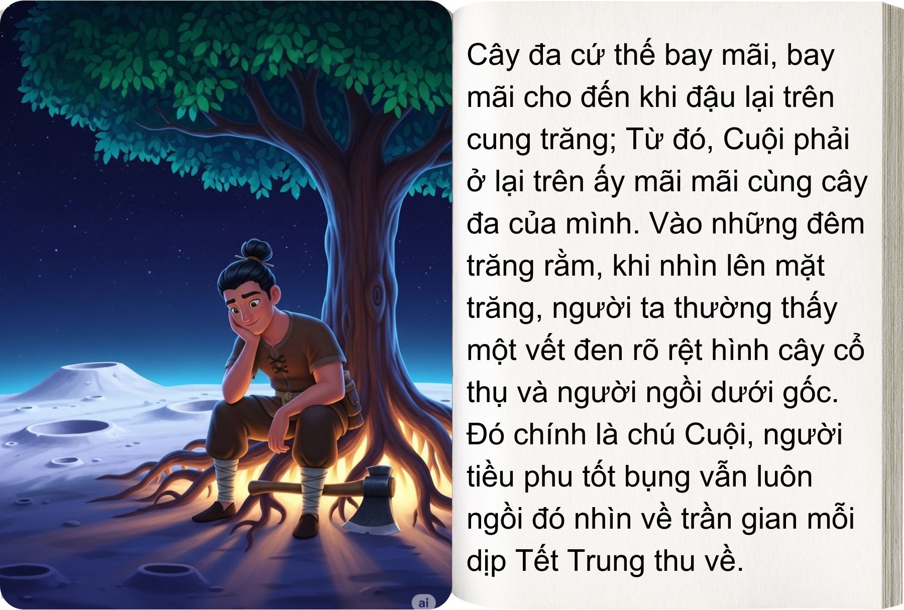 Nhìn lên mặt trăng, người ta thấy một vết đen rõ như hình một cây cổ thụ có người ngồi dưới gốc. Từ đó, người ta gọi cái hình ấy là chú Cuội ngồi gốc cây đa.