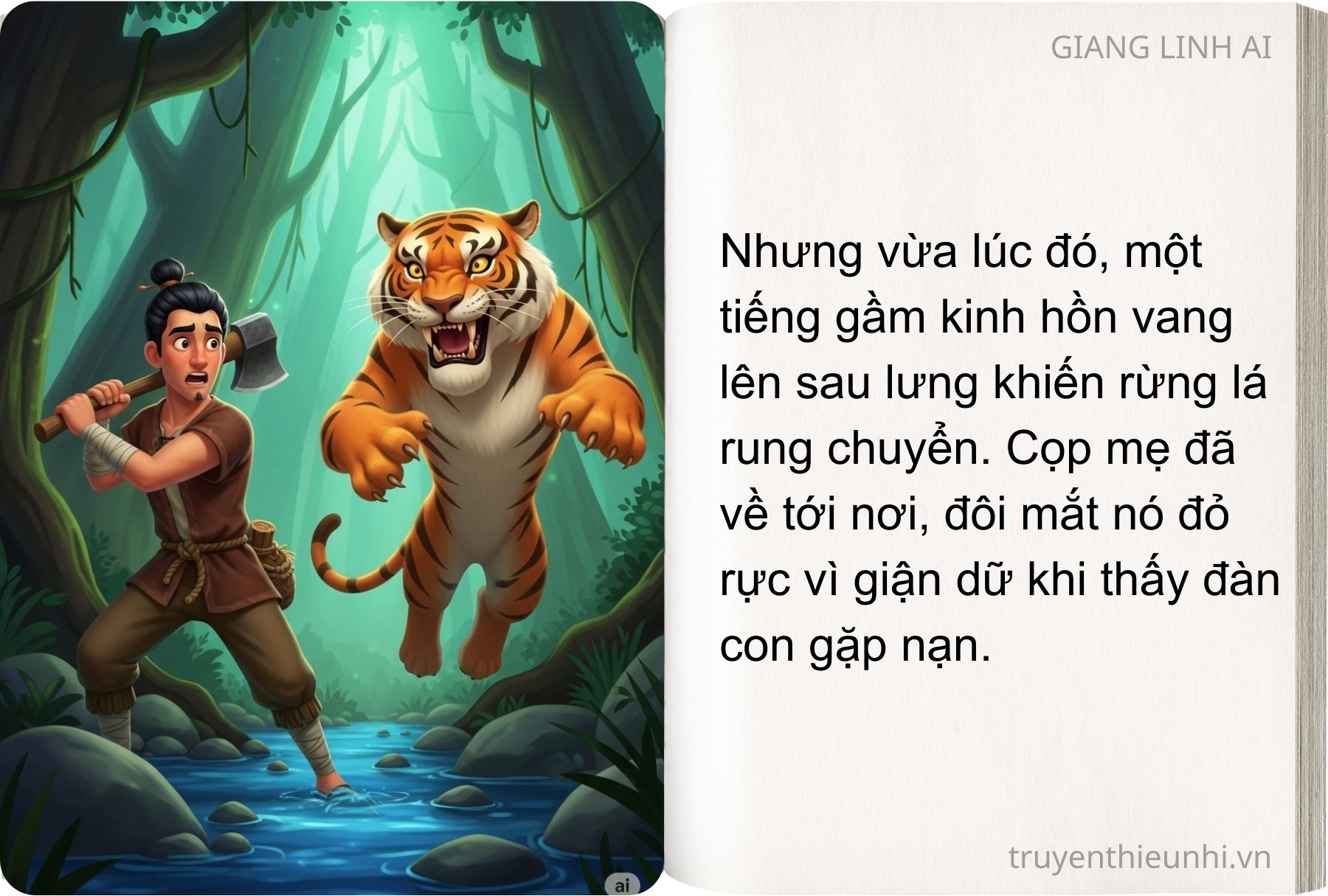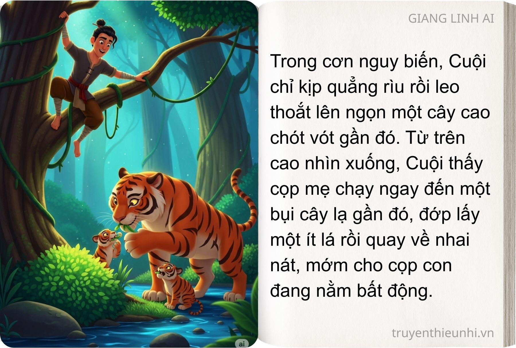 Cuội liền xông đến vung rìu bổ cho mỗi con một nhát lăn quay trên mặt đất. Nhưng vừa lúc đó, cọp mẹ cũng về tới nơi. Nghe tiếng gầm kinh hồn ở sau lưng, Cuội chỉ kịp quẳng rìu leo thoắt lên ngọn một cây cao.