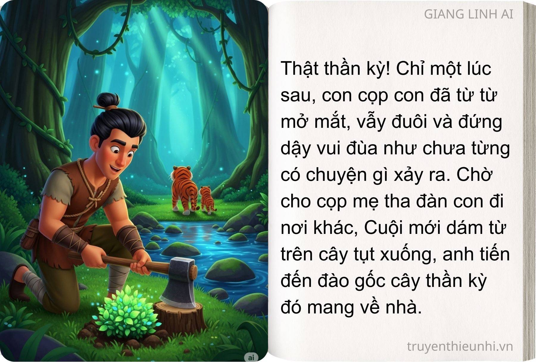 Từ trên cao nhìn xuống, Cuội thấy cọp mẹ chạy đến một bụi cây gần đó, đớp một ít lá về nhai và mớm cho con. Thật thần kỳ chỉ vài phút sau, bốn con cọp con đã vẫy đuôi sống lại. Chờ cho cọp mẹ tha con đi nơi khác, cuội đến tìm bụi cây kia, đào gốc mang về.