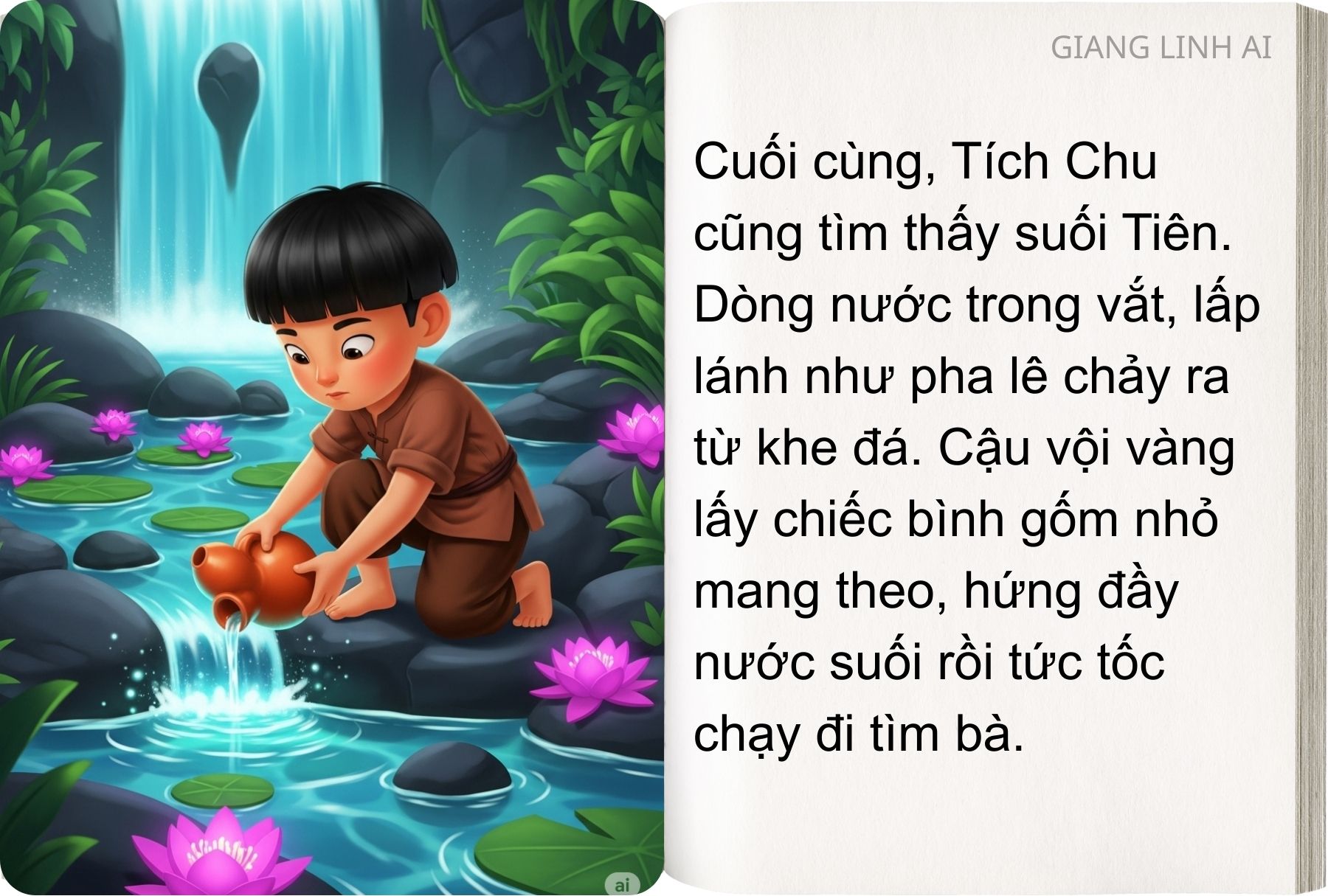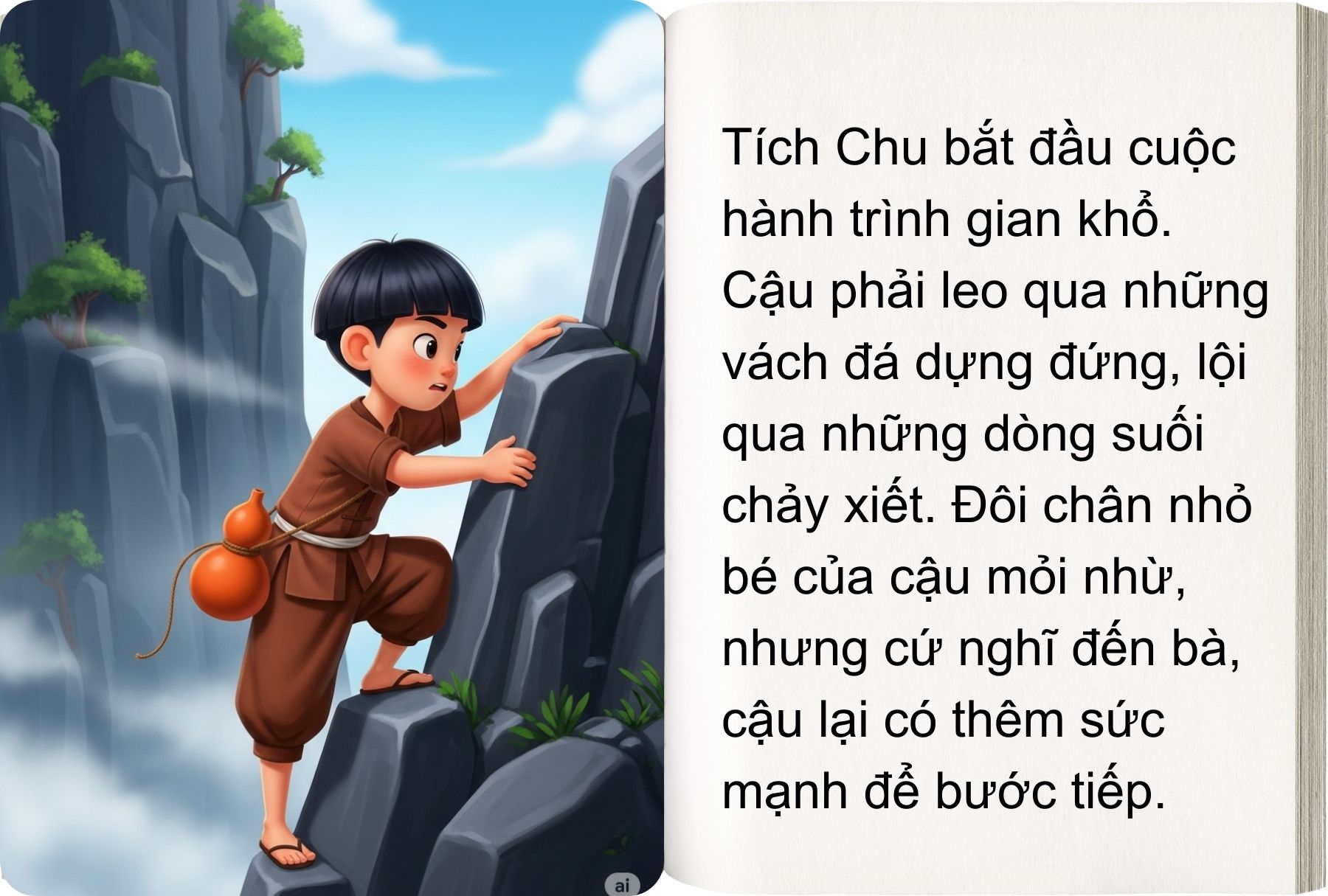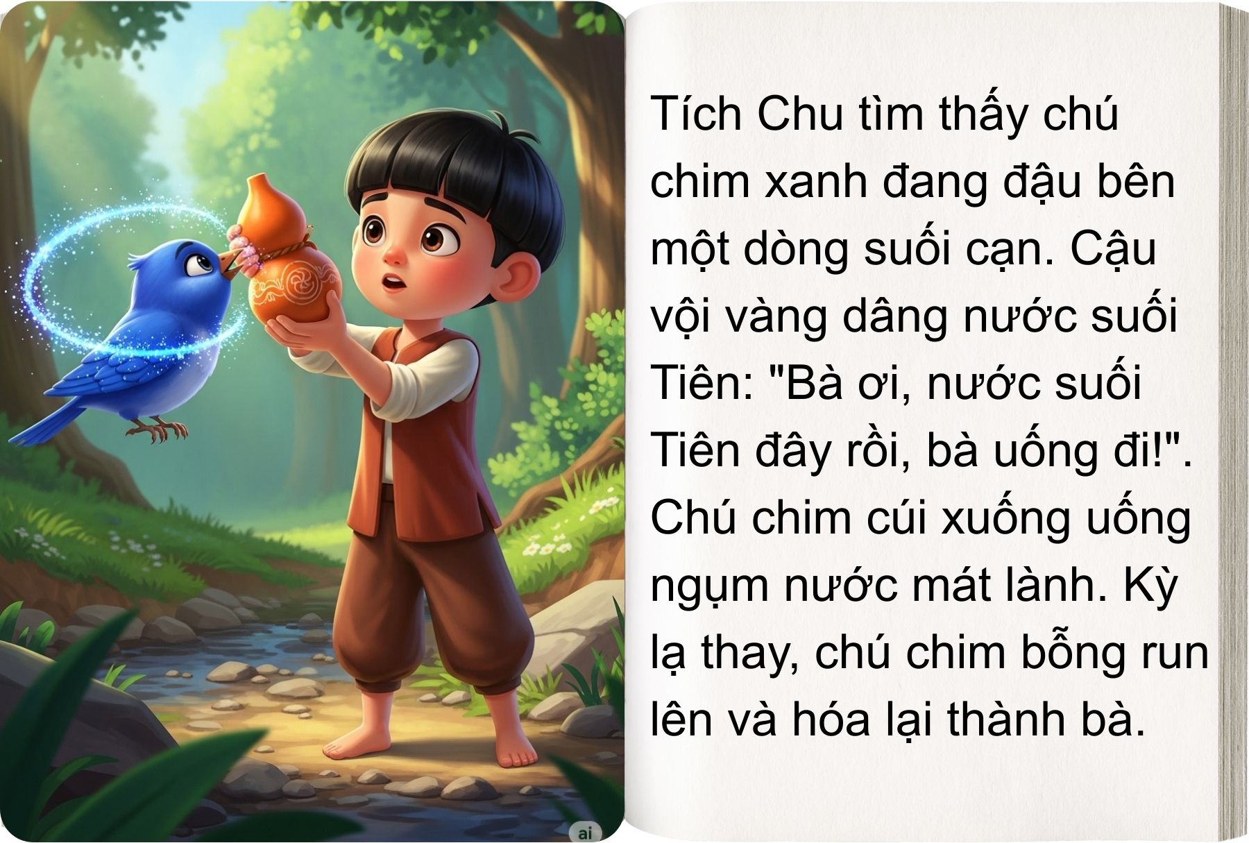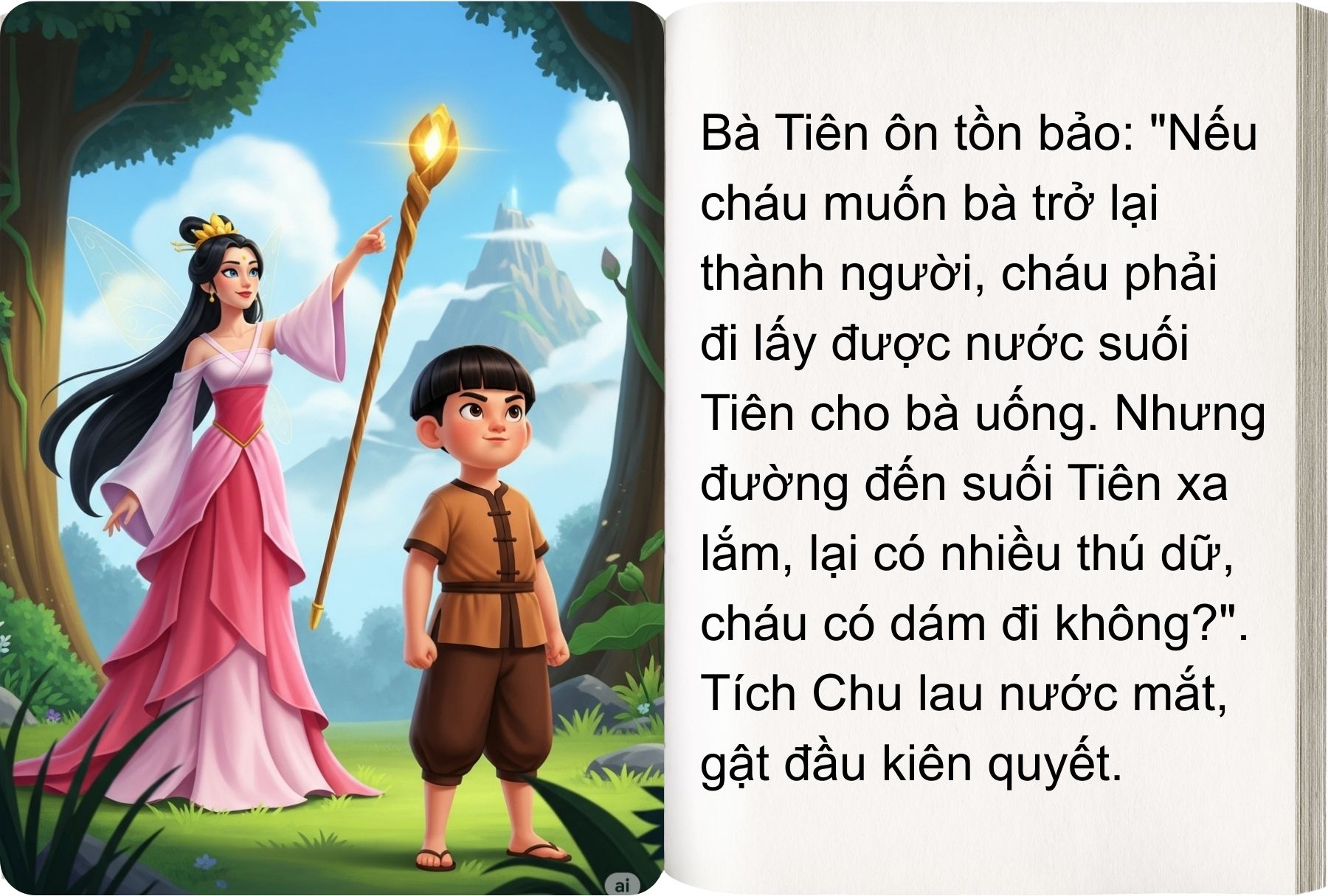 – Tích Chu ơi! Nếu cháu muốn cho bà cháu trở lại thành người thì cháu phải đi lấy nước suối Tiên cho bà cháu uống. Đường lên suối Tiên xa lắm, cháu có đi được không?