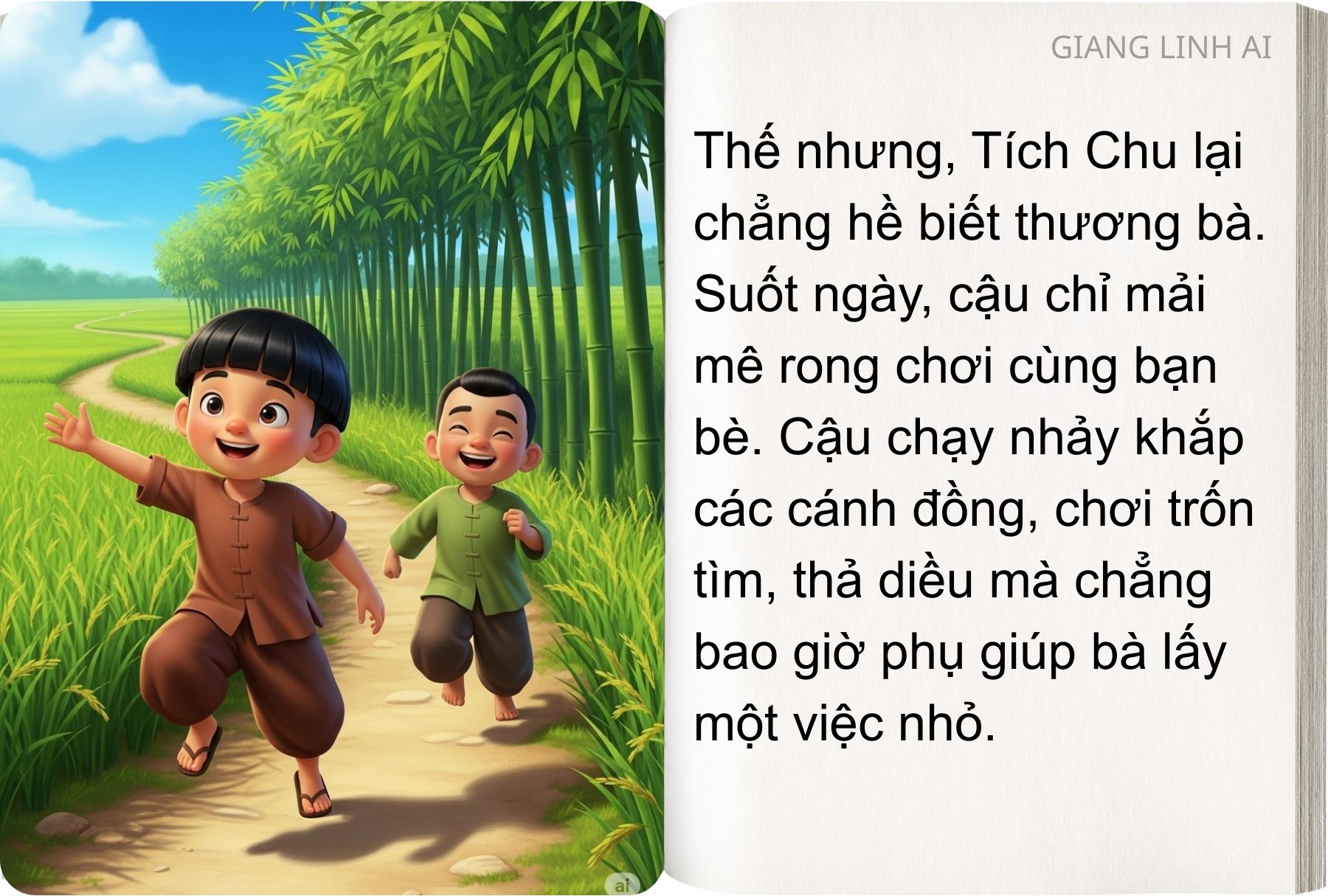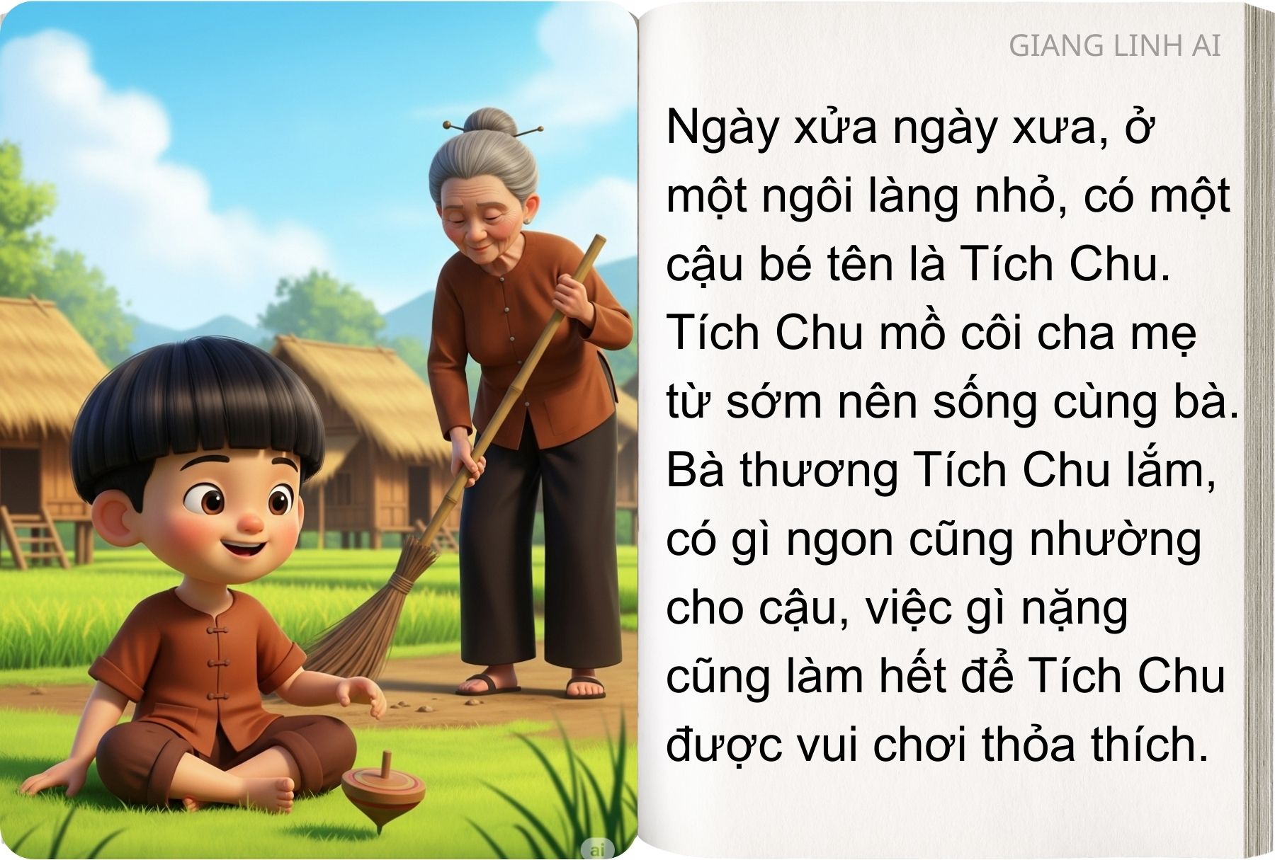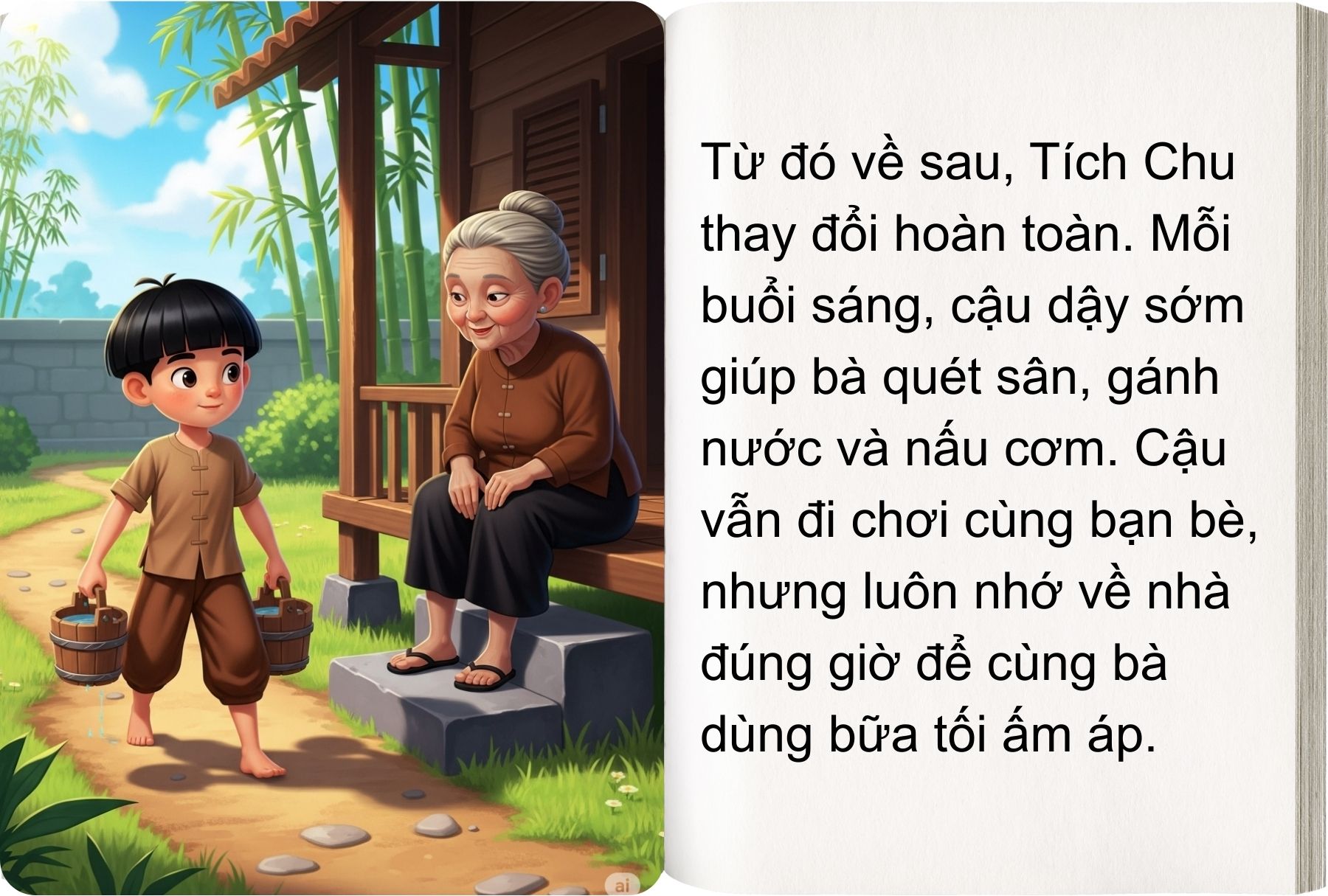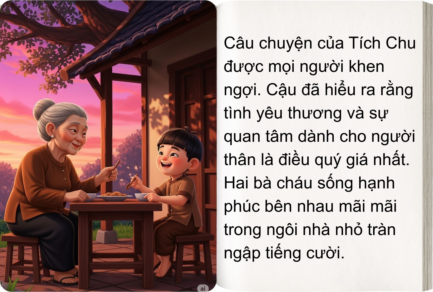 Từ đấy, cậu bé Tích Chu hết lòng yêu thương chăm sóc bà. Hai bà cháu lại chung sống hạnh phúc bên nhau.
