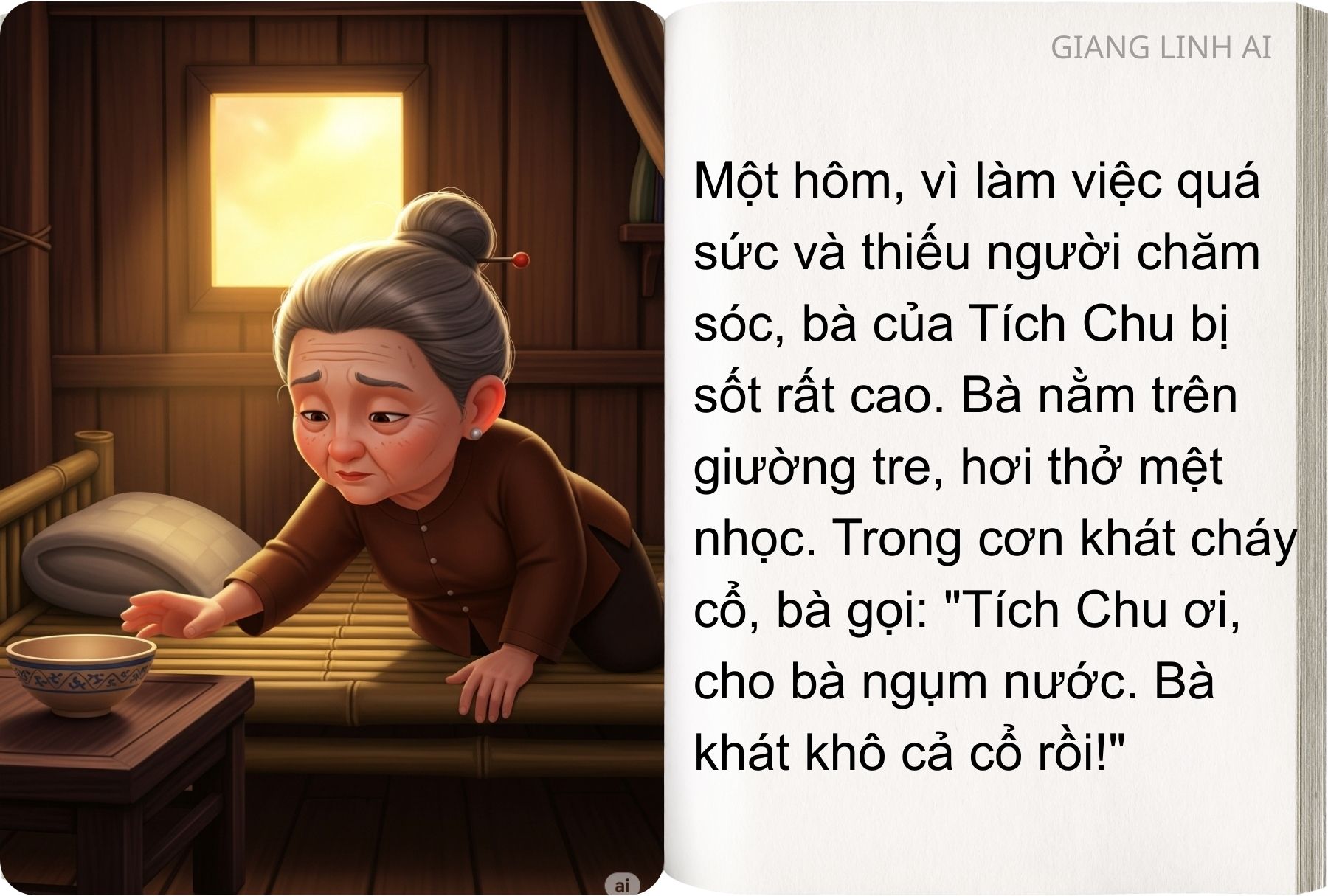 – Tích Chu ơi, cho bà ngụm nước nào. Bà khát khô cả cổ rồi!