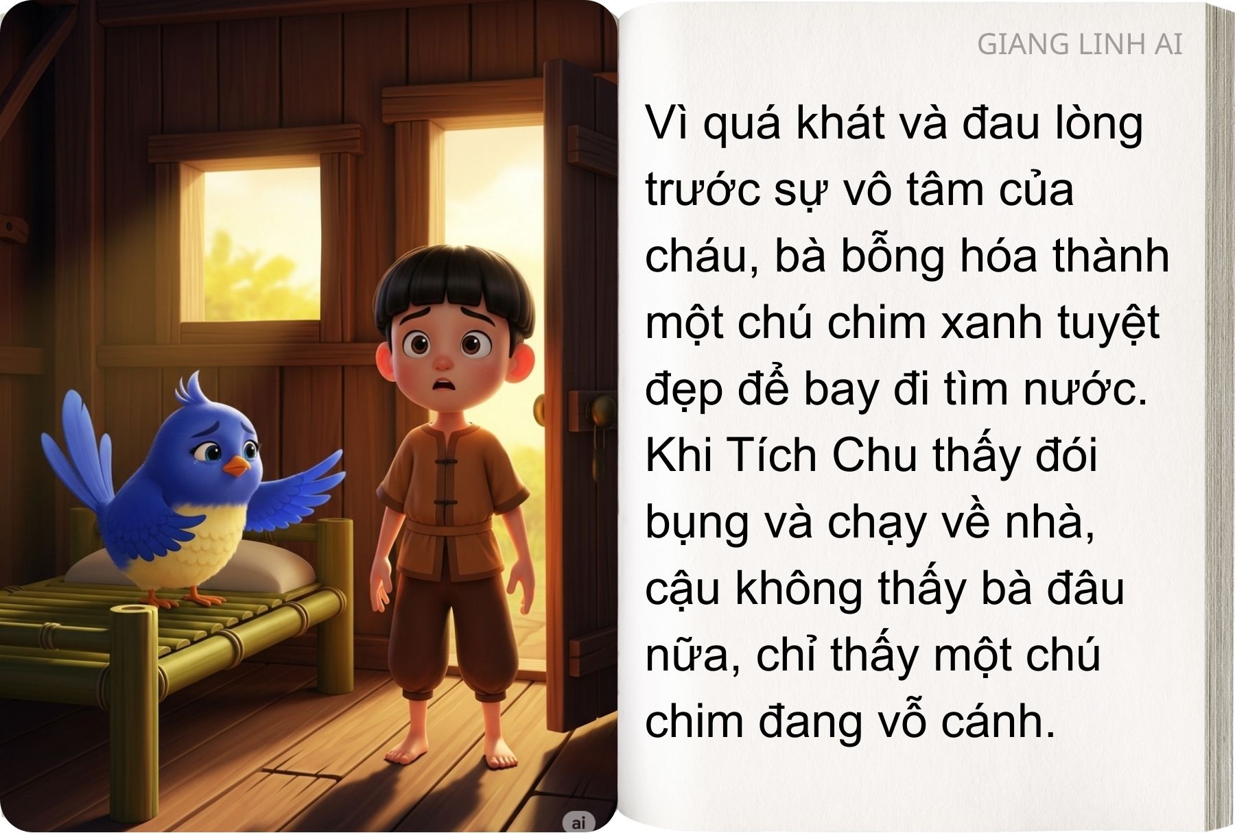 – Cúc… cu… cu! Cúc… cu…cu! Chậm mất rồi cháu ạ. Bà khát quá, không thể chụi nổi, phải hóa thành con chim để bay đi kiếm nước. Bà đi đây! Bà không về với cháu nữa đâu!