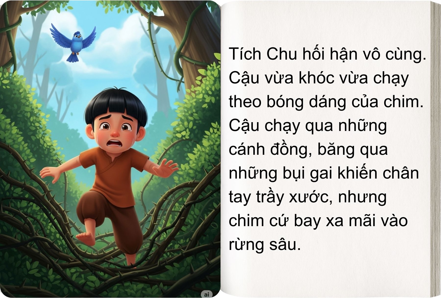 Nói rồi chim vỗ cánh bay đi. Tích Chu vội chạy theo bà, cứ nhằm theo hướng chim bay mà chạy. Cuối cùng Tích Chu gặp chim đang uống nước ở một dòng suối mát. Tích Chu gọi: