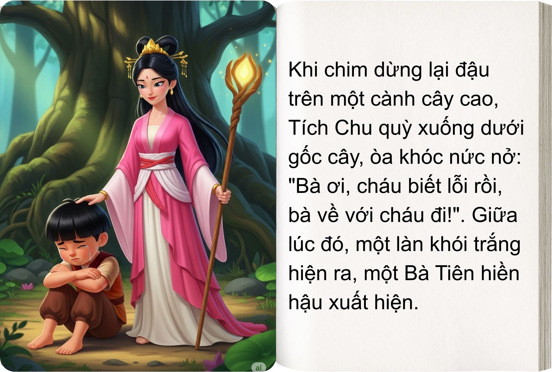 Nghe tiếng chim nói, Tích Chu òa lên khóc. Tích Chu thương bà và hối hận lắm. Giữa lúc đó một bà Tiên hiện ra. Bà Tiên bảo Tích Chu:
