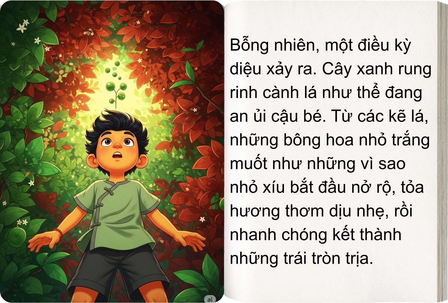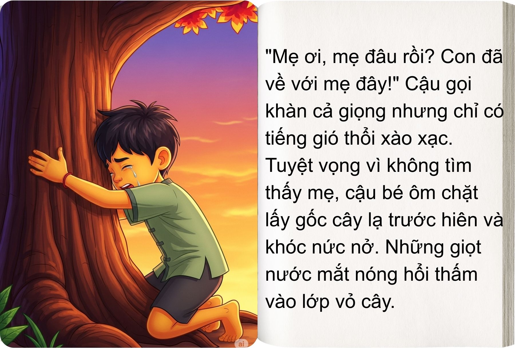 Đúng là tiếng của mẹ rồi! Chú bé òa lên khóc nức nở. Cây xanh lại run rẩy xòe những tán cây ra ôm lấy cậu bé, giống như người mẹ đang yêu thương, vỗ về con cái.