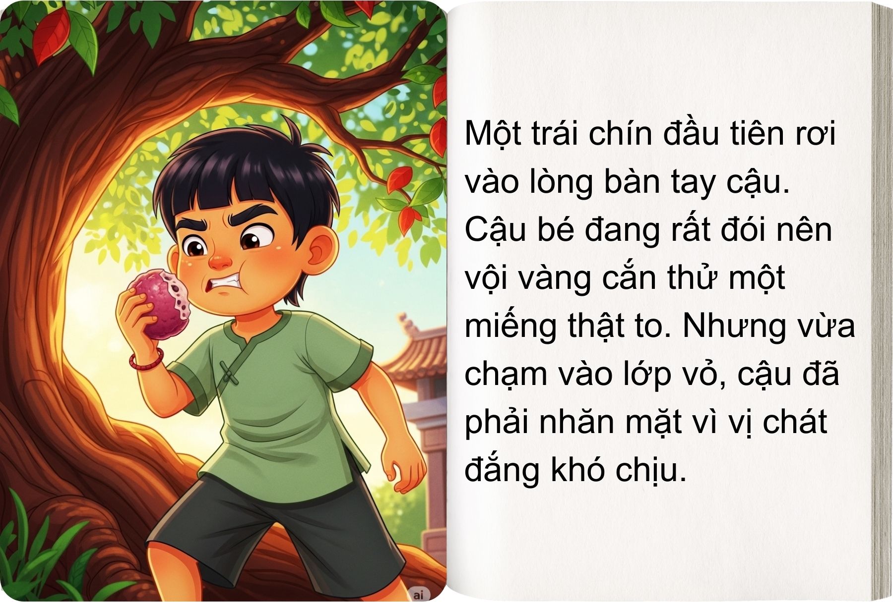 “Sự tích Cây Vú Sữa” kể về một cậu bé vì giận mẹ mà bỏ đi, để rồi khi quay về, chỉ còn lại một cây lạ với dòng nhựa ngọt lành như vòng tay của mẹ.