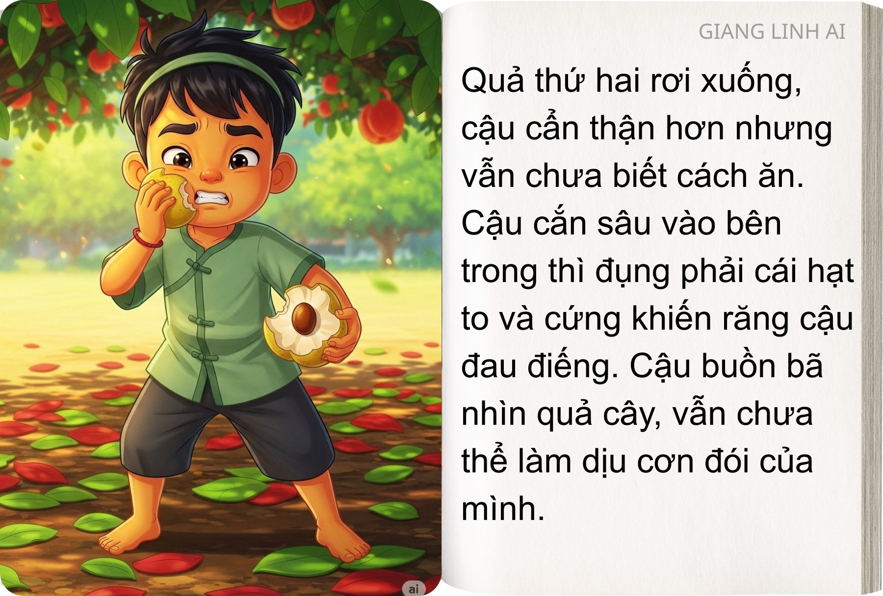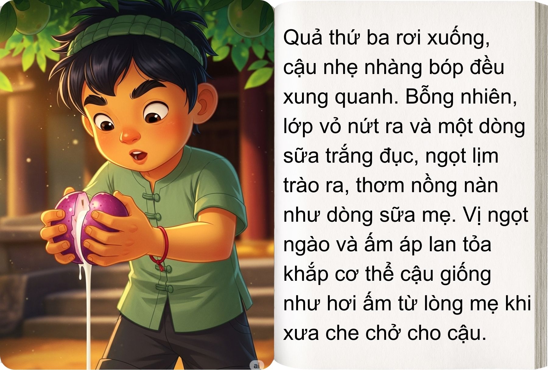 Quả thứ ba tiếp tục rơi xuống tay chú. Chú vội vàng xoay quanh trái chín cho mềm ra, thì thấy trong trái nứt ra một kẽ nhỏ, một dòng sữa màu trắng trào. Chú ngửa mồm uống dòng sữa ấy, vị ngọt thơm y như dòng sữa của mẹ. Sau khi uống xong, cậu bé có cảm giác đó rất quen thuộc, khoan khoái đến lạ thường.