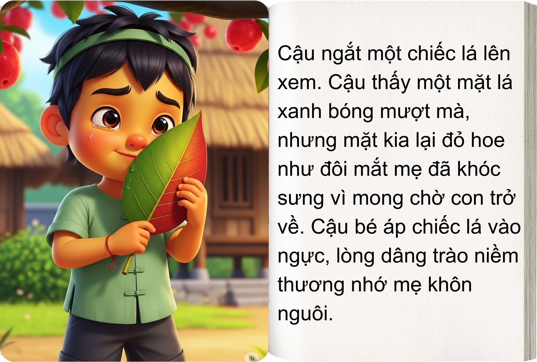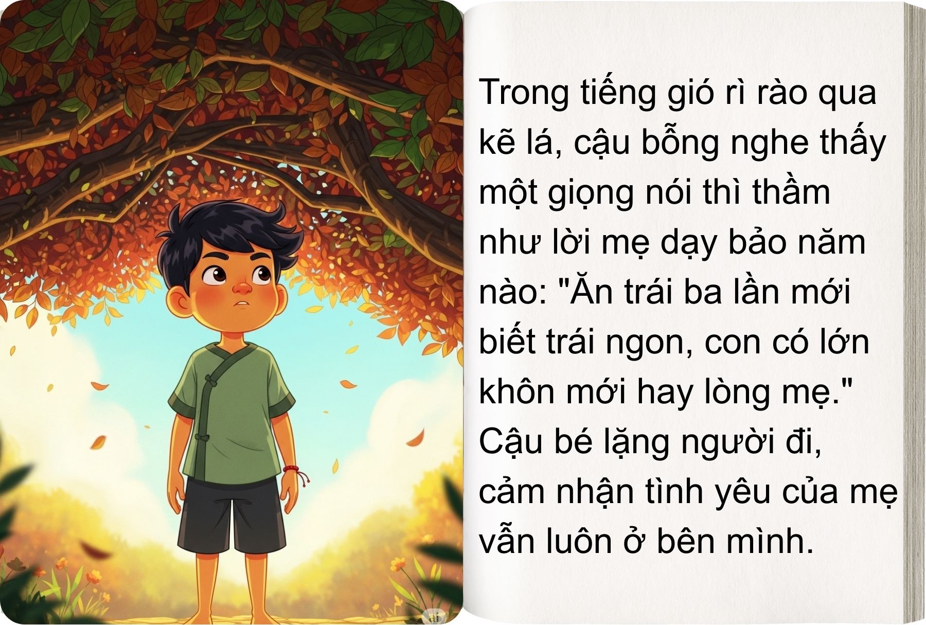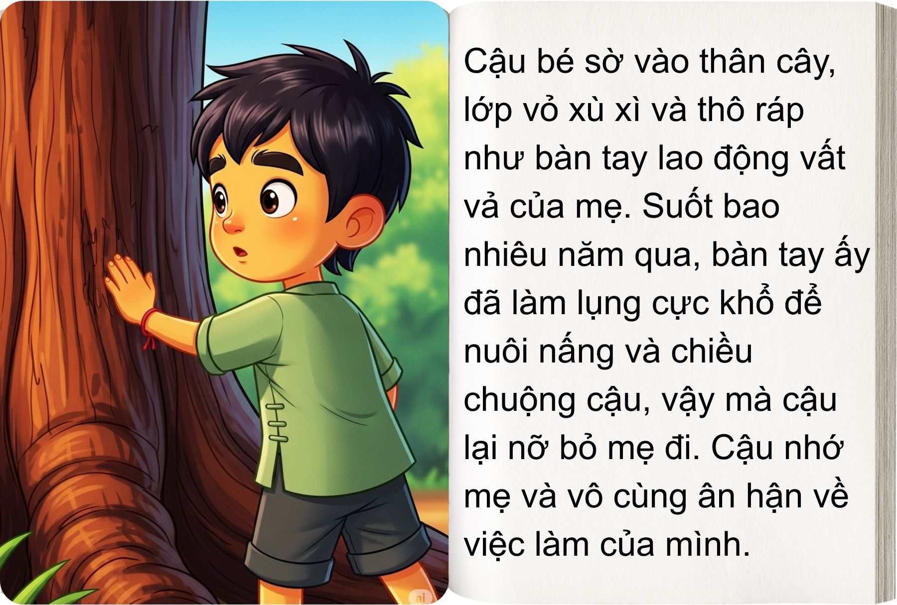 Cậu bé ôm lấy cây. Vỏ cây xù xì như bàn tay tần tảo của mẹ, lá cây một mặt xanh bóng, một mặt đỏ hoe như mắt người mẹ khóc cạn nước chờ con. Cậu nghe vẳng vẳng bên tai tiếng lá rì rào: