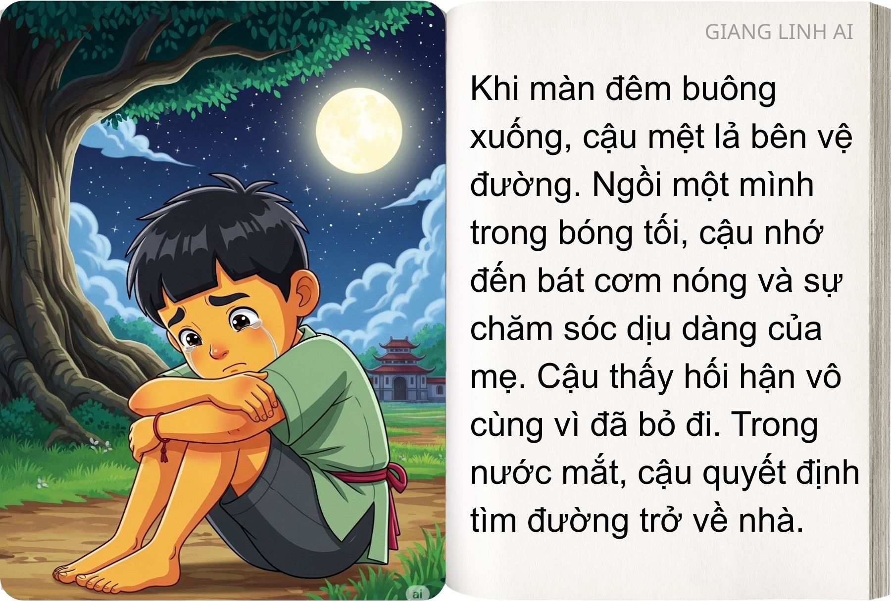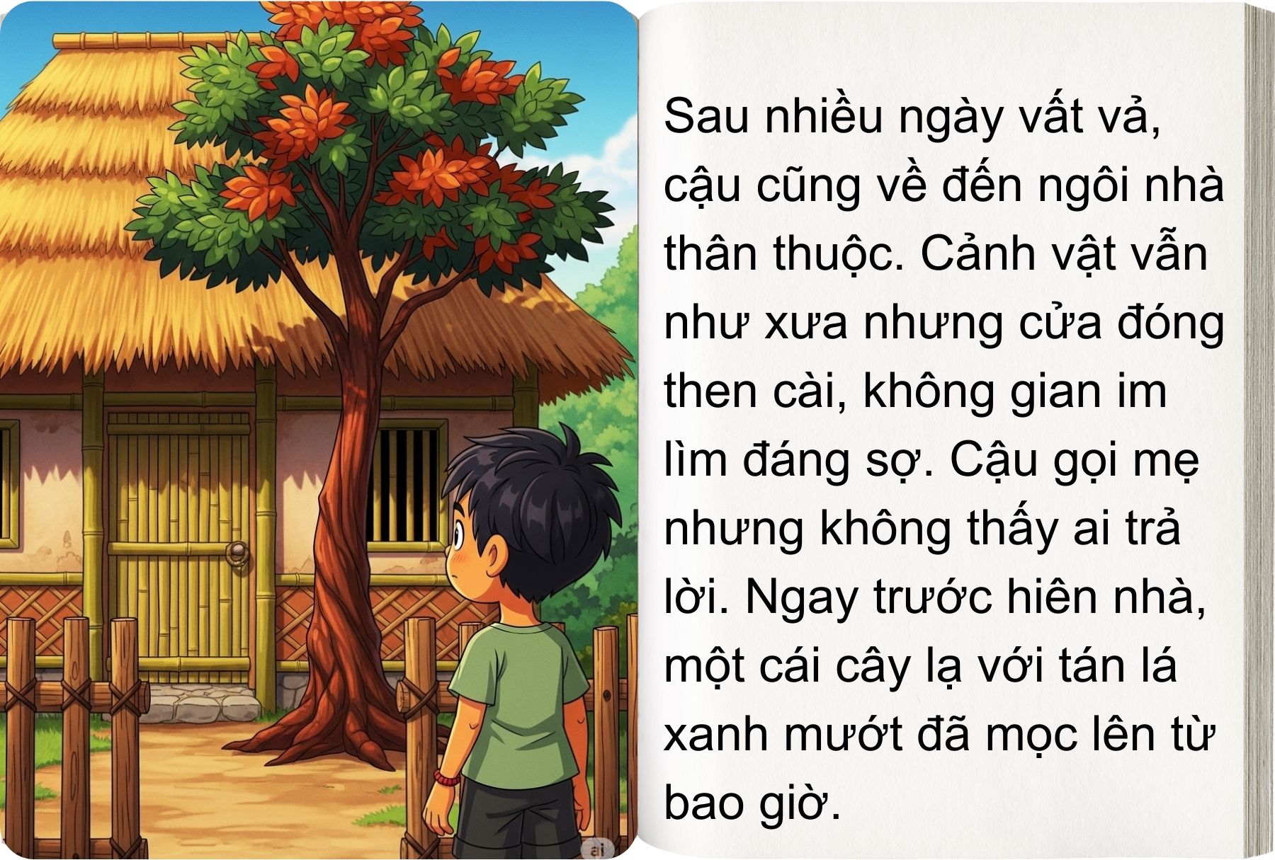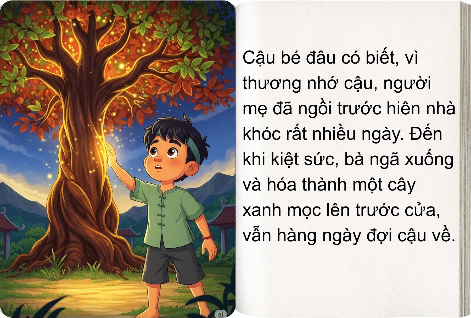 Cậu bé đâu có biết, vì thương nhớ cậu, người mẹ đã ngồi trước hiên nhà khóc rất nhiều ngày. Đến khi kiệt sức, bà ngã xuống và hóa thành một cây xanh mọc lên trước cửa, vẫn hàng ngày đợi cậu về.