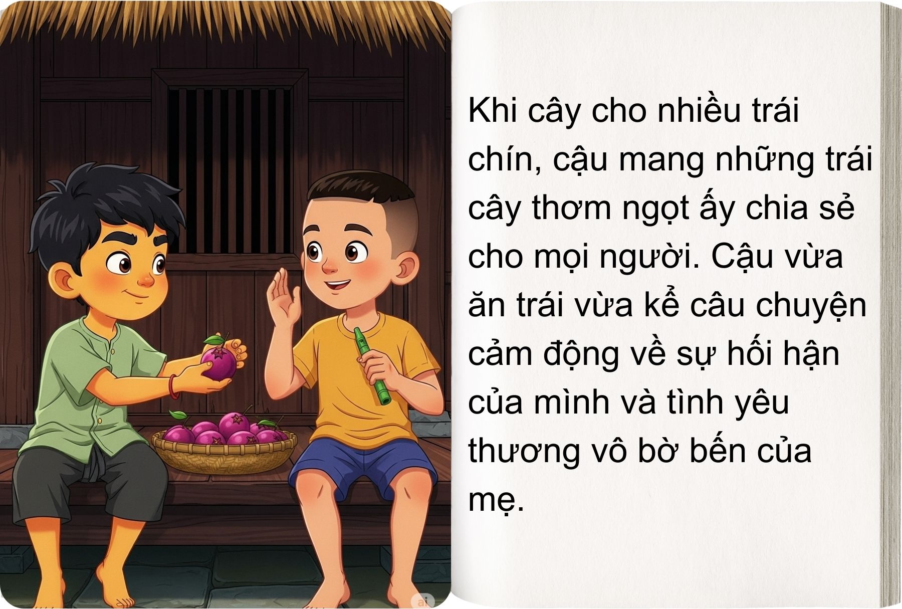Cậu mang những trái cây thơm ngọt ấy chia sẻ cho những người bạn của mình và kể cho họ nghe câu chuyện về người mẹ tuyệt vời, về những sai lầm mình đã mắc phải. Mọi người đều ngậm ngùi và tự hứa với bản thân phải cố gắng chăm ngoan hơn để không khiến cho mẹ phải phiền lòng.