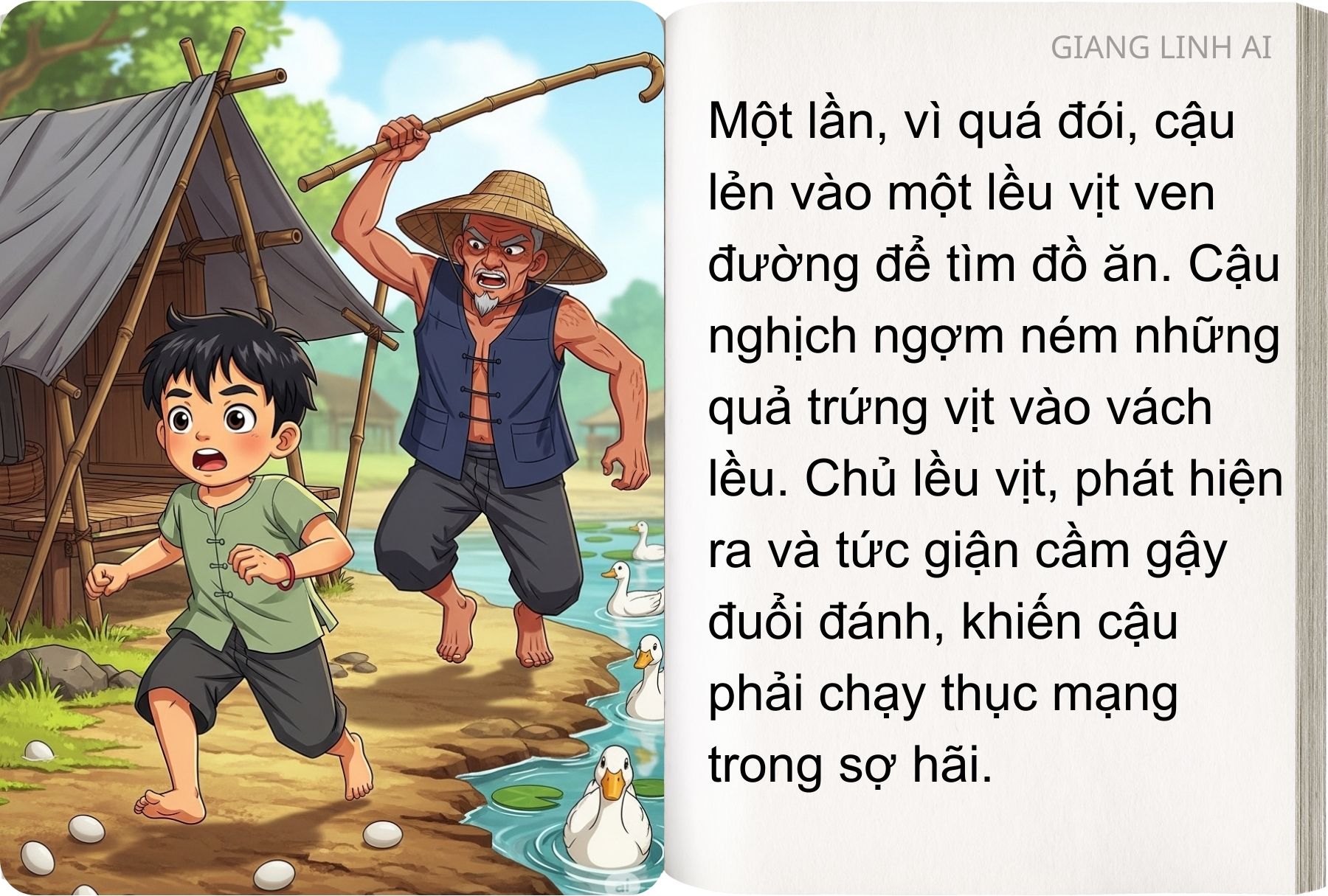 Người chủ lều vịt đang ngủ, nghe tiếng vịt kêu hoảng sợ liền tỉnh giấc. Anh ta ngó nhìn ra ngoài qua khe cửa thì thấy cậu bé đang ném trứng. Điên tiết, anh vớ một cây gậy rất to chạy ra đuổi cậu bé. Cậu bé hốt hoảng chạy thục mạng, không dám ngoái đầu nhìn lại.